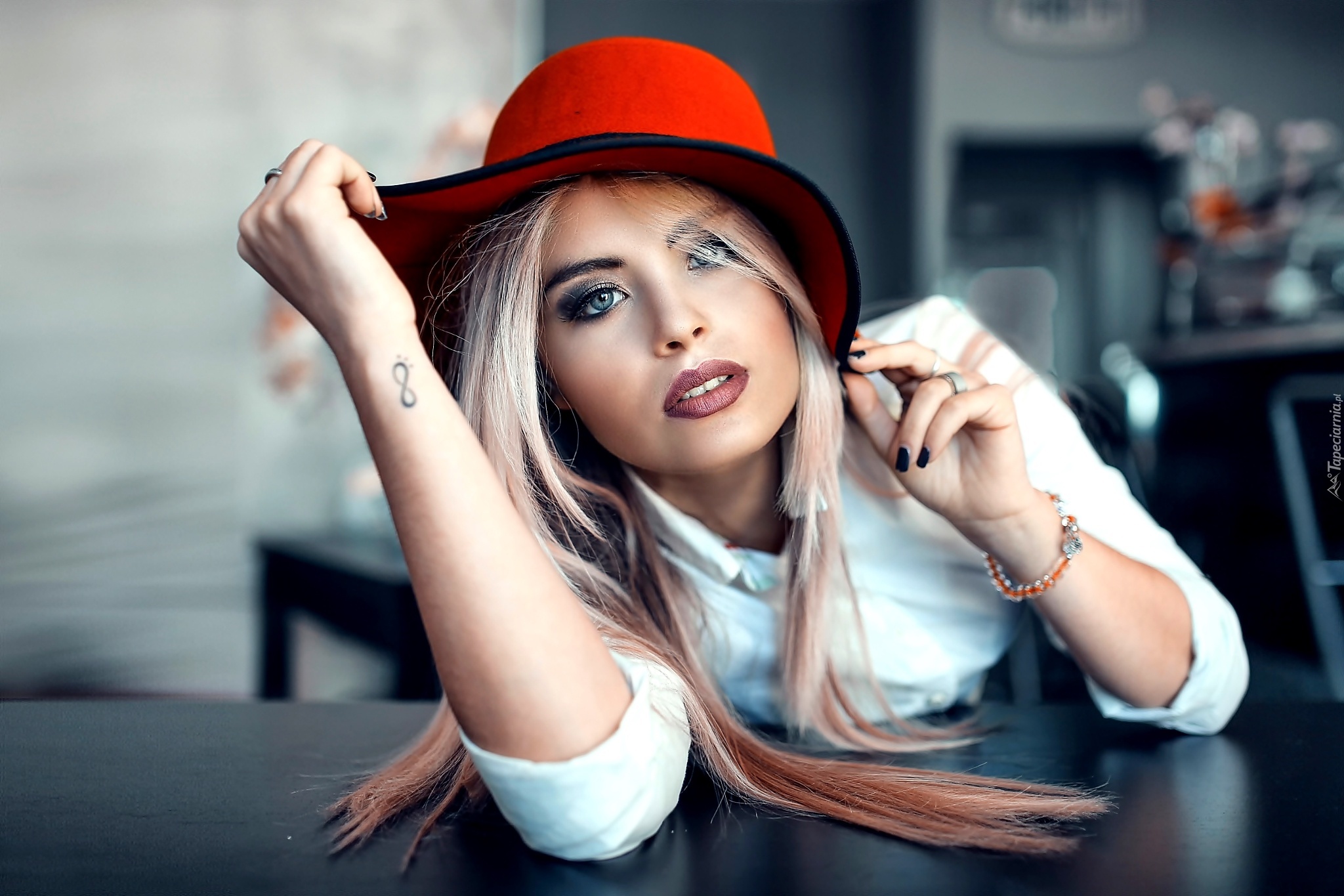 Edytor tapety: Siedząca, Kobieta, Blondynka, Czerwony, Kapelusz
