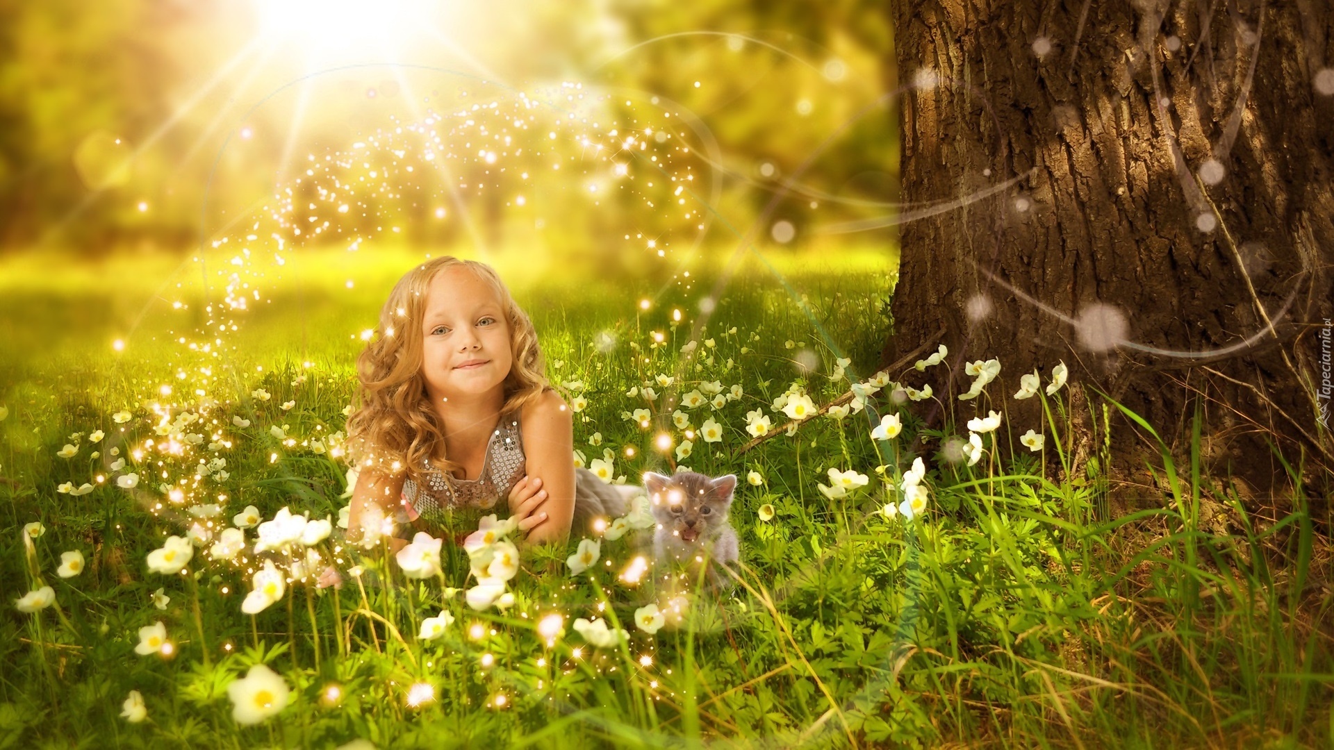 Edytor tapety: Dziewczynka, Kotek, Promienie, Słońca, Łąka