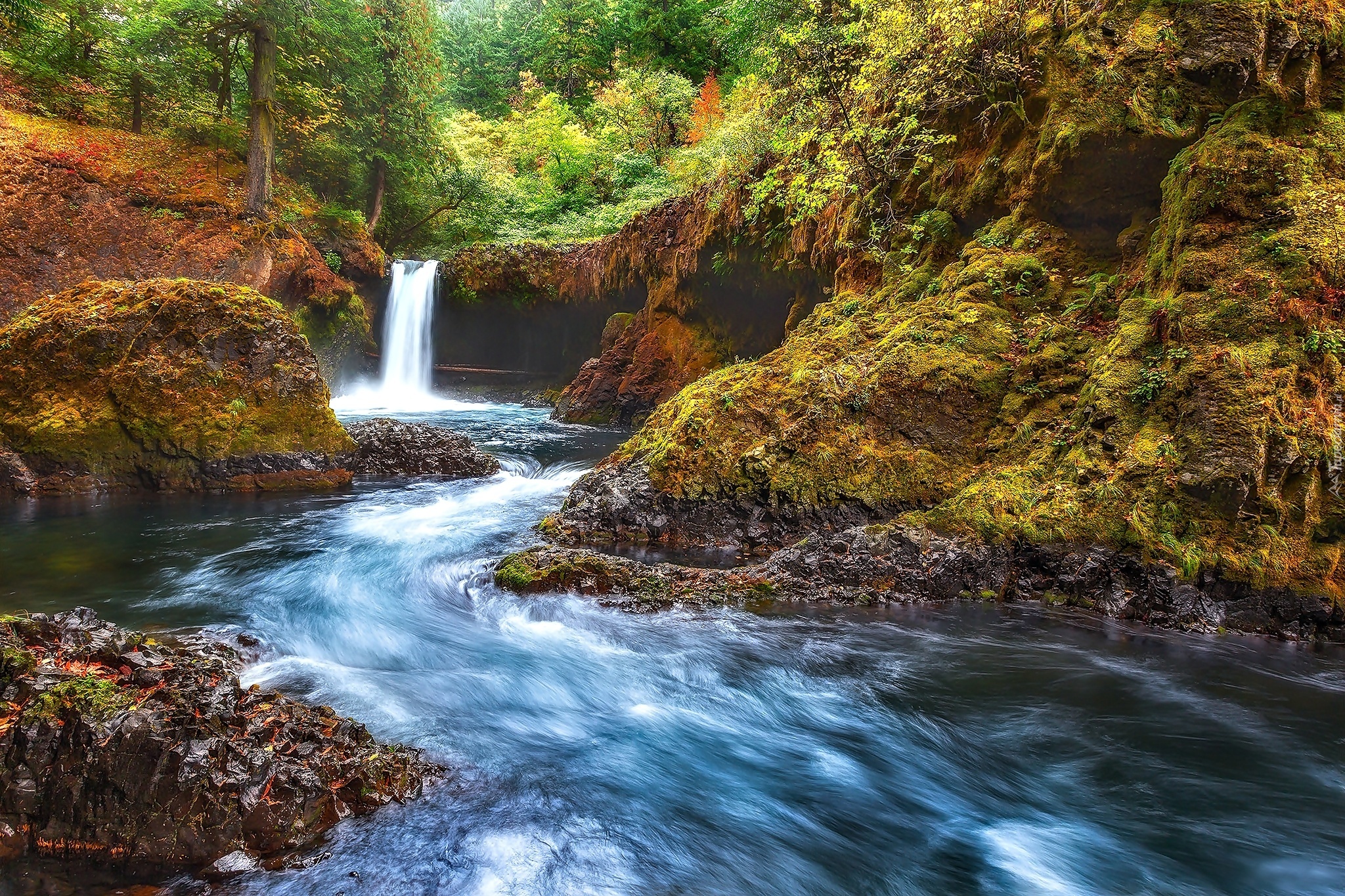 Edytor tapety: Wodospad, Las, Rzeka