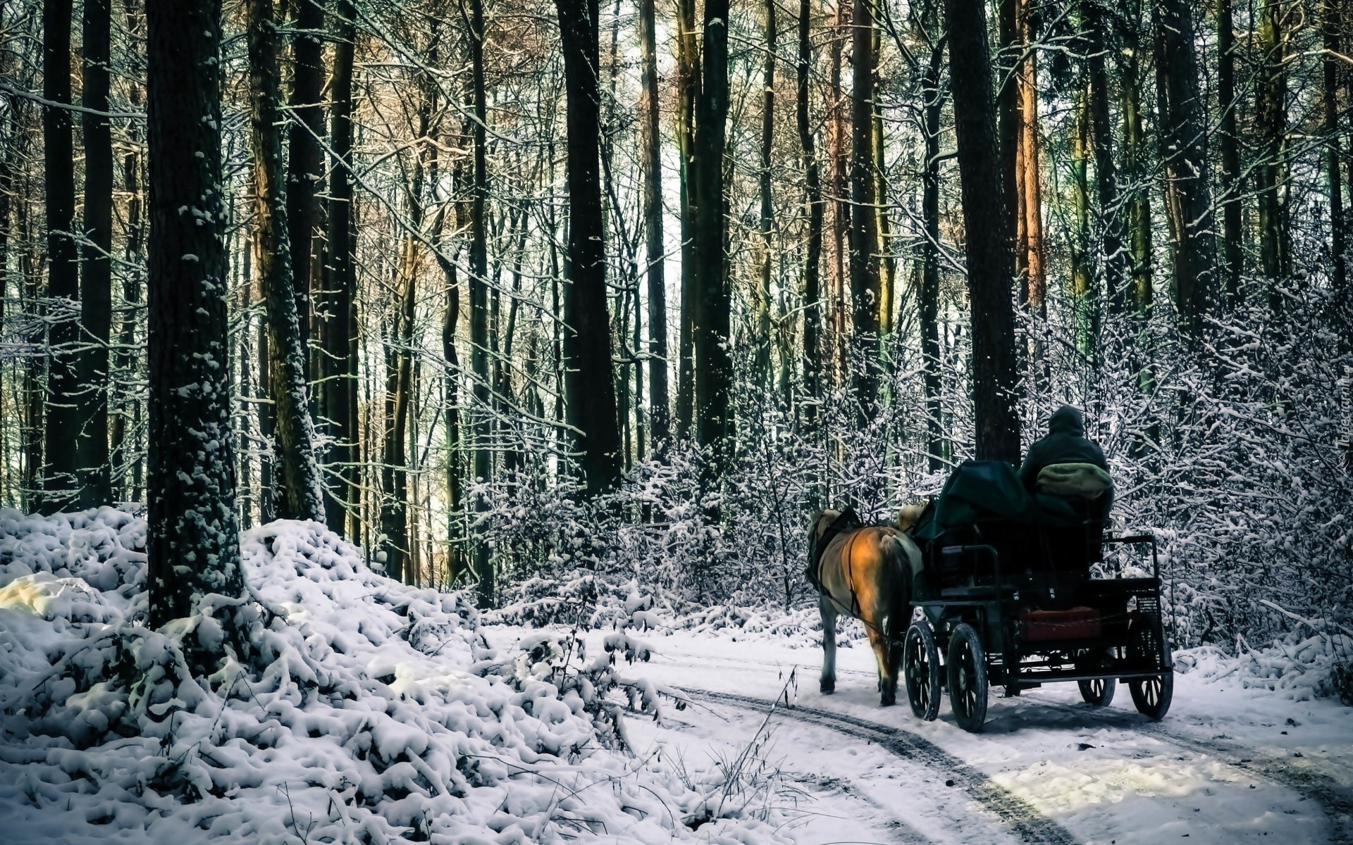 Edytor tapety: Las, Bryczka, Ludzie, Konie, Droga, Zima