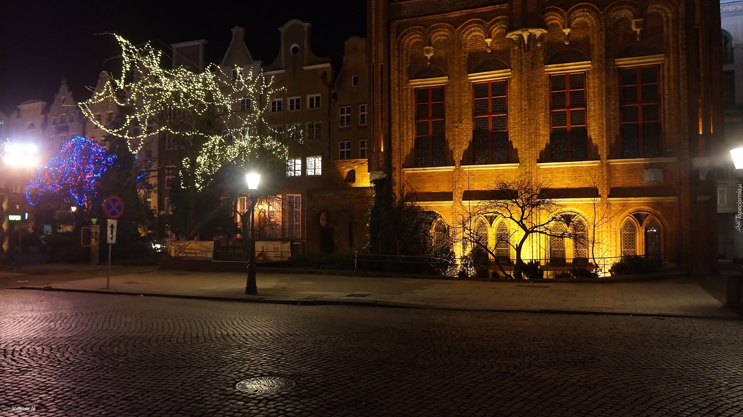 Edytor tapety: Miasto, Gdańsk, Uliczka, Noc, Budynki, Świąteczne