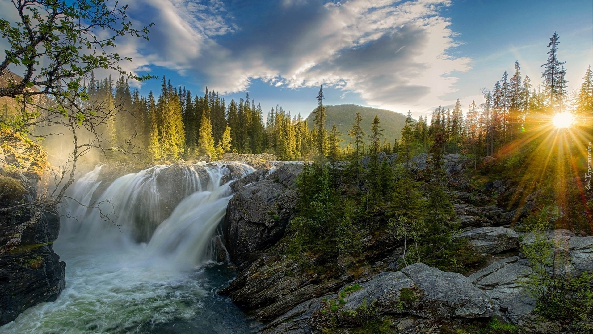 Edytor tapety: Wschód, Słońca, Góry, Las, Rzeka, Wodospad