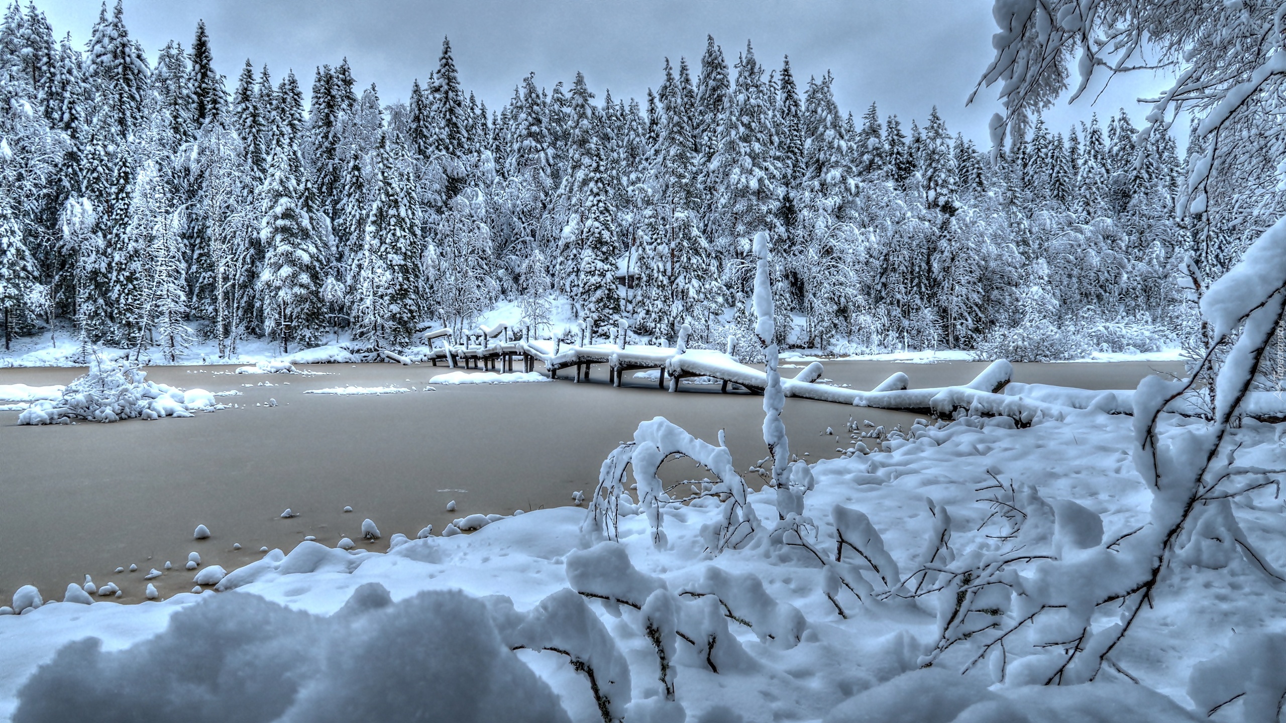 Edytor tapety: Zima, Las, Rzeka, Mostek