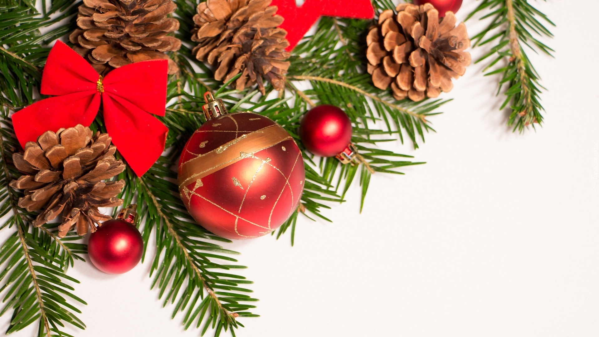 Edytor tapety: Świąteczna, Dekoracja, Czerwone, Bombki, Kokardka, Szyszki