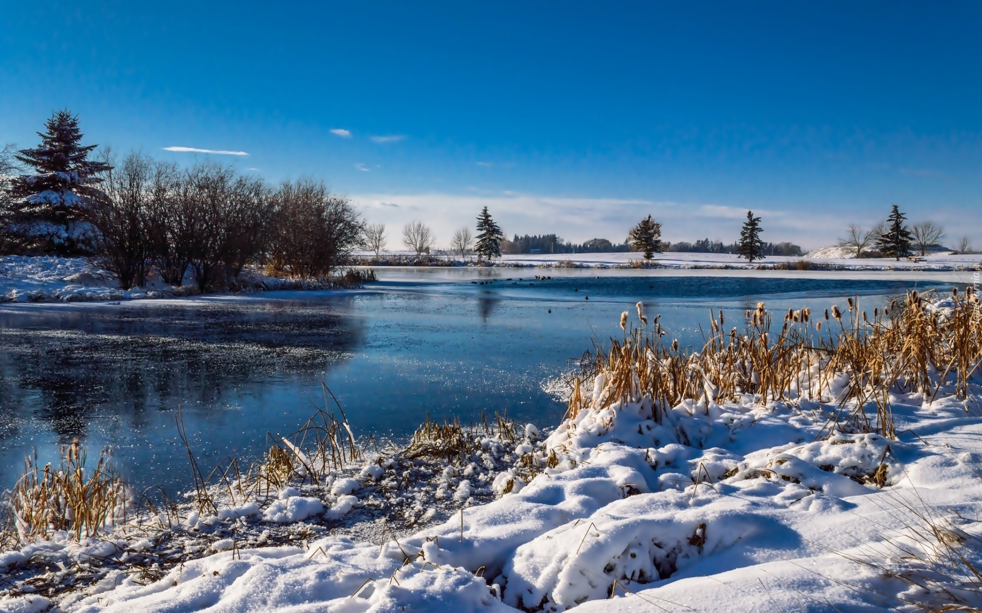 Edytor tapety: Rzeka, Kaczki, Drzewa, Zimowy, Krajobraz