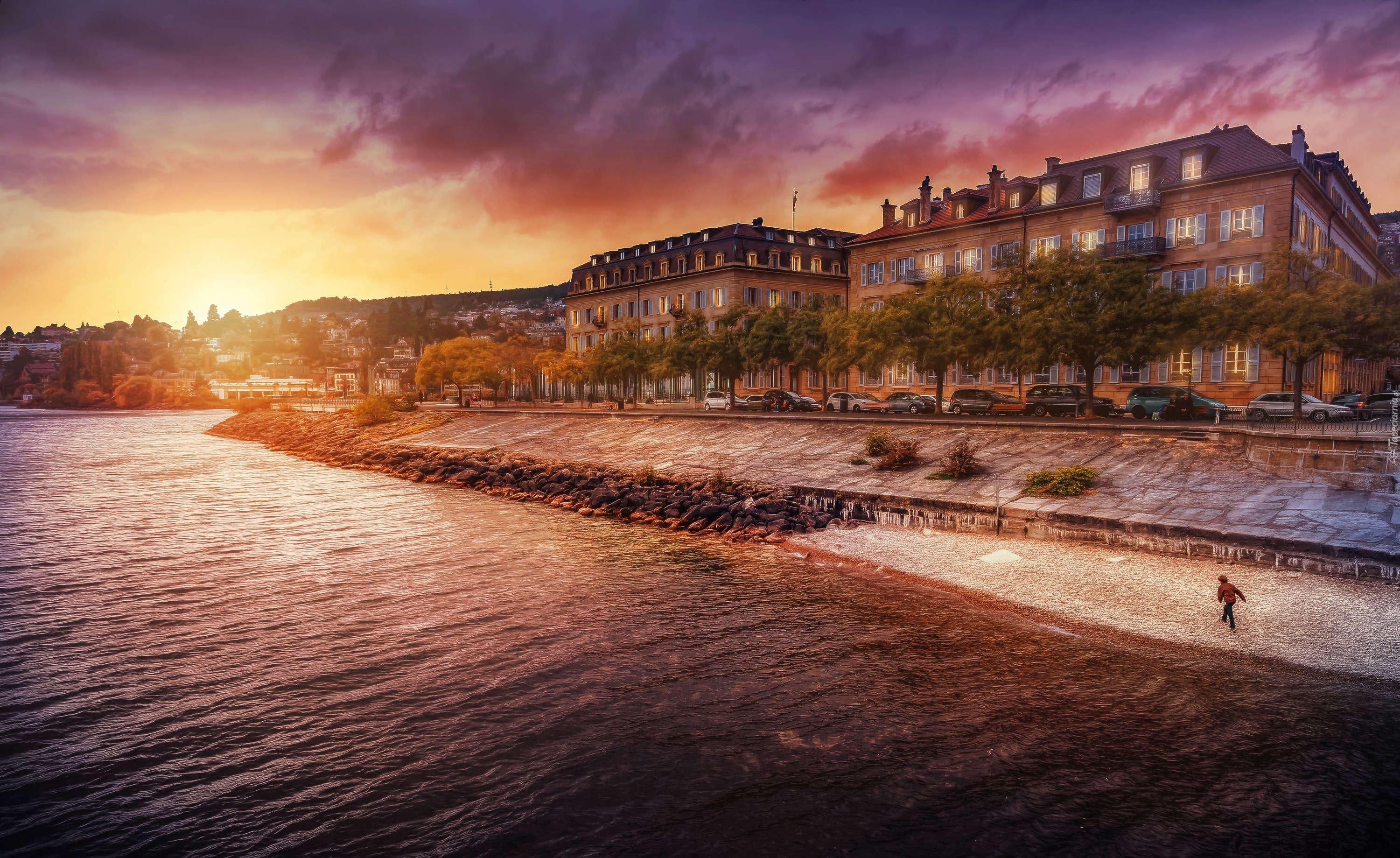Edytor tapety: Rzeka, Domy, Jesień, Samochody