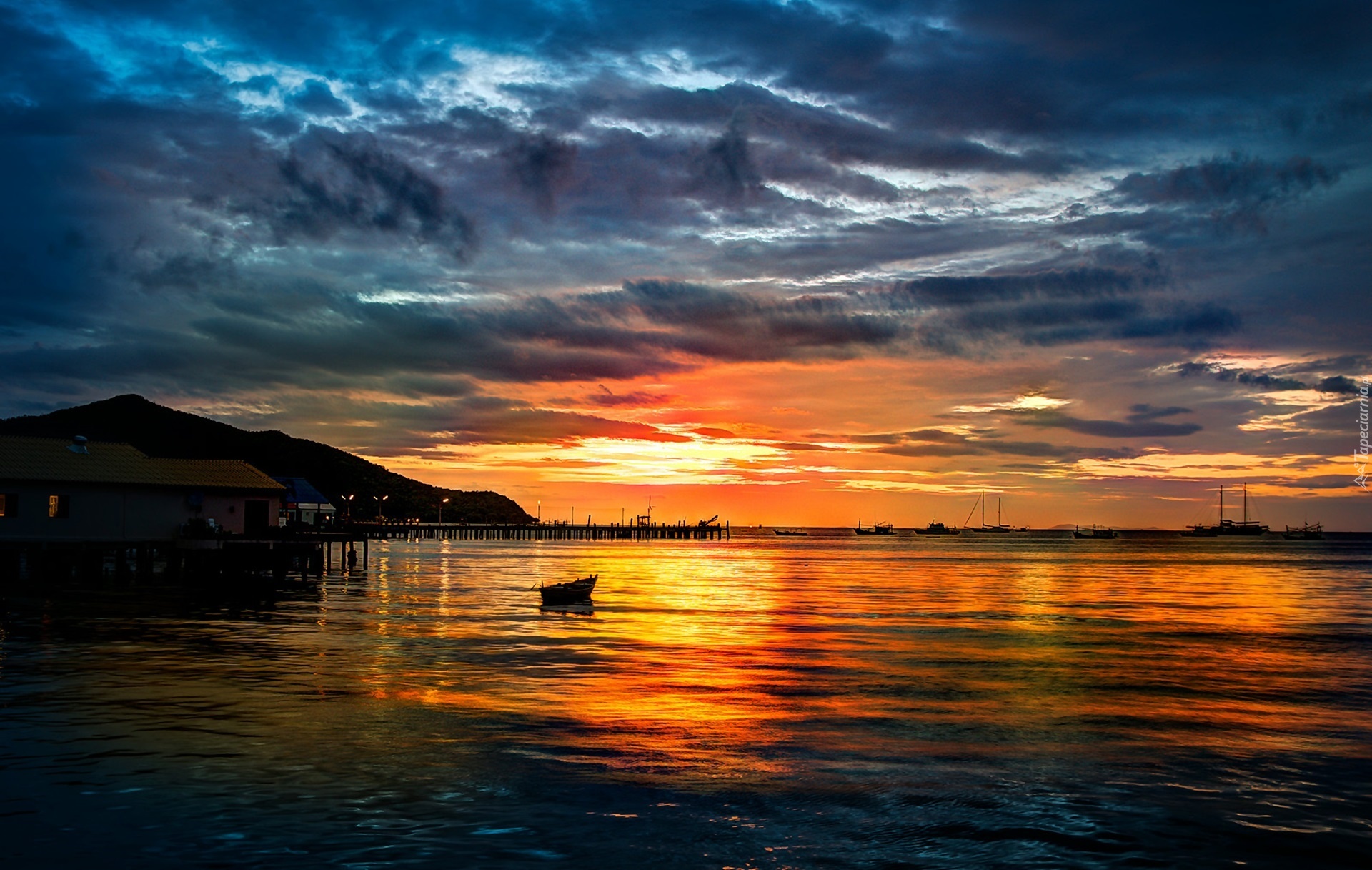 Edytor tapety: Zachód, Słońca, Morze, Łódka, Góry