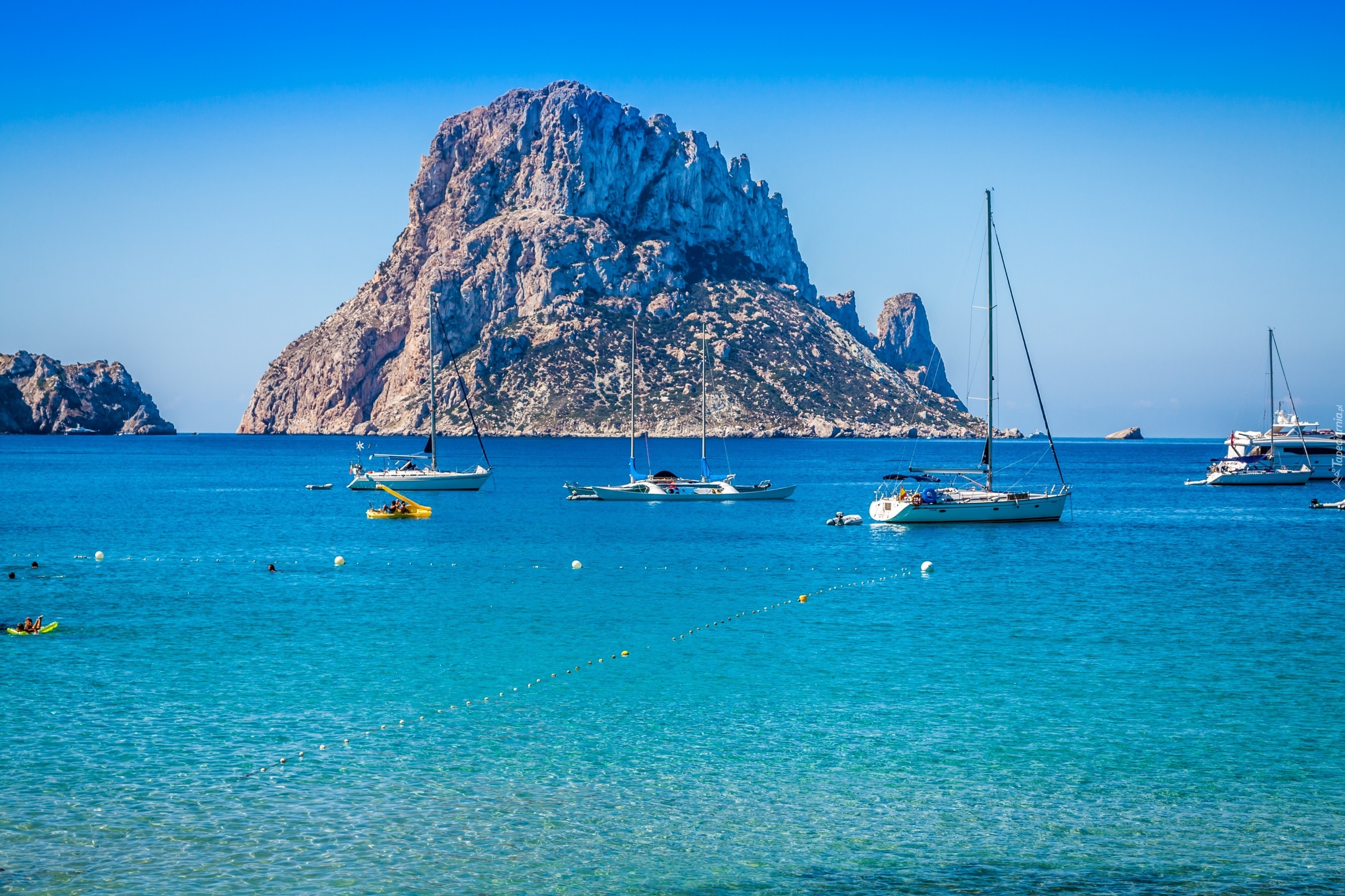 Edytor tapety: Ibiza, Hiszpania, Morze, Skały, Łódki