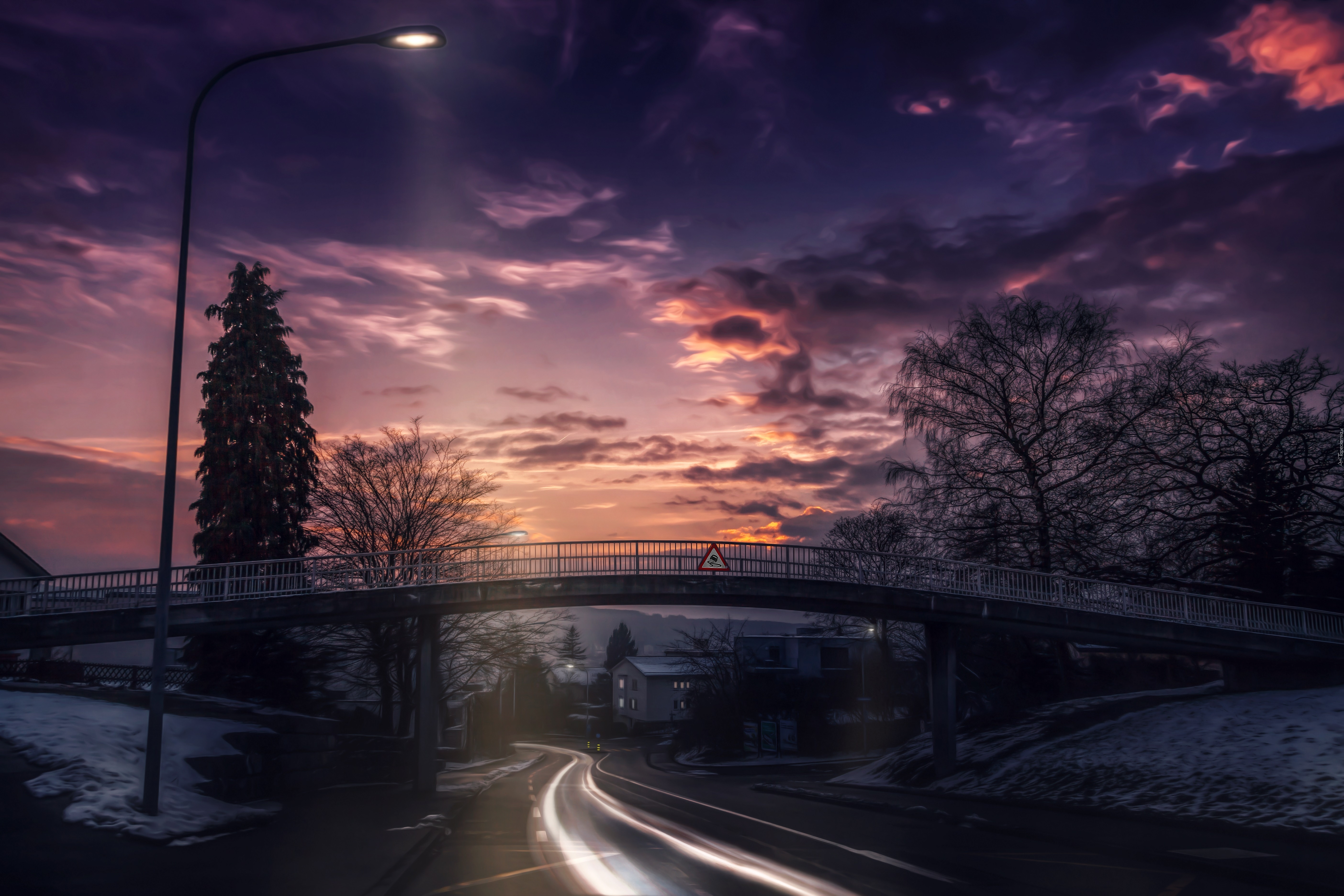 Edytor tapety: Most, Drzewa, Ulica, Purpurowe, Niebo