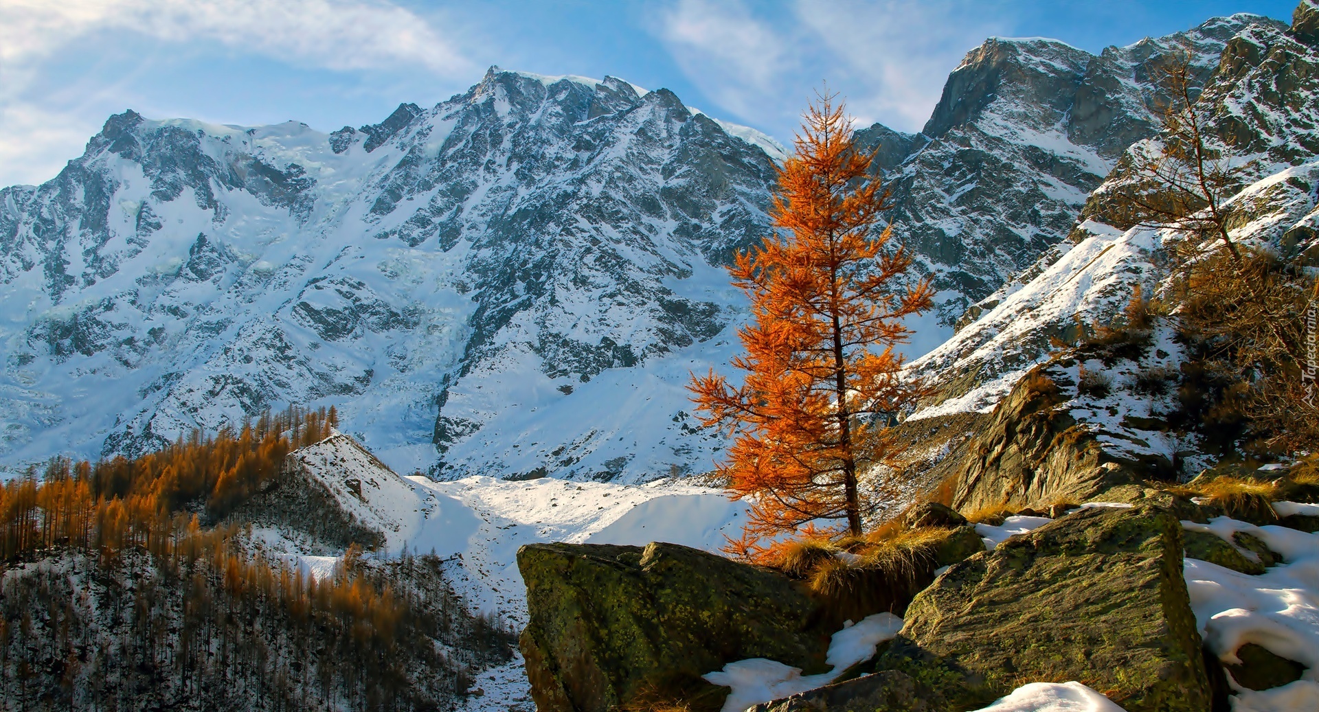 Edytor tapety: Góry, Śnieg, Kamienie, Skały, Drzewa, Jesień