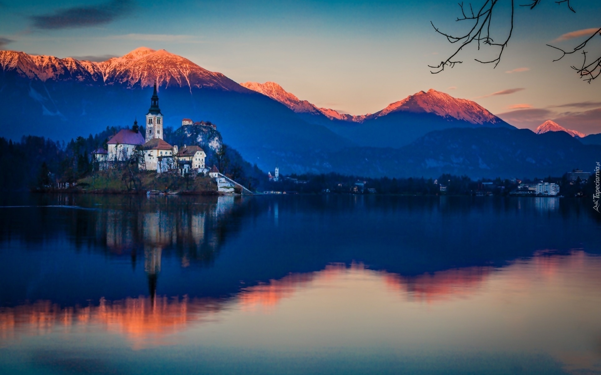 Edytor tapety: Jezioro, Bled, Kościół, Zamek, Góry, Słowenia