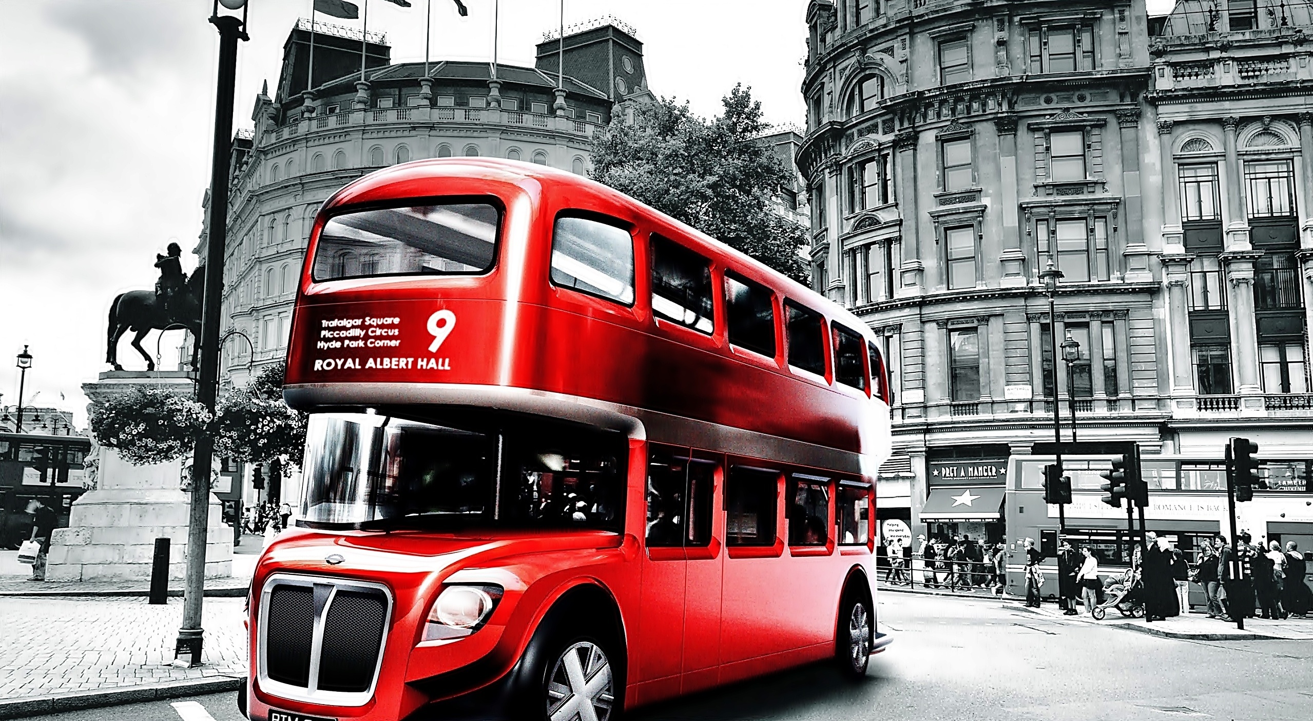 Edytor tapety: Czerwony Autobus, Ulica, Budynki
