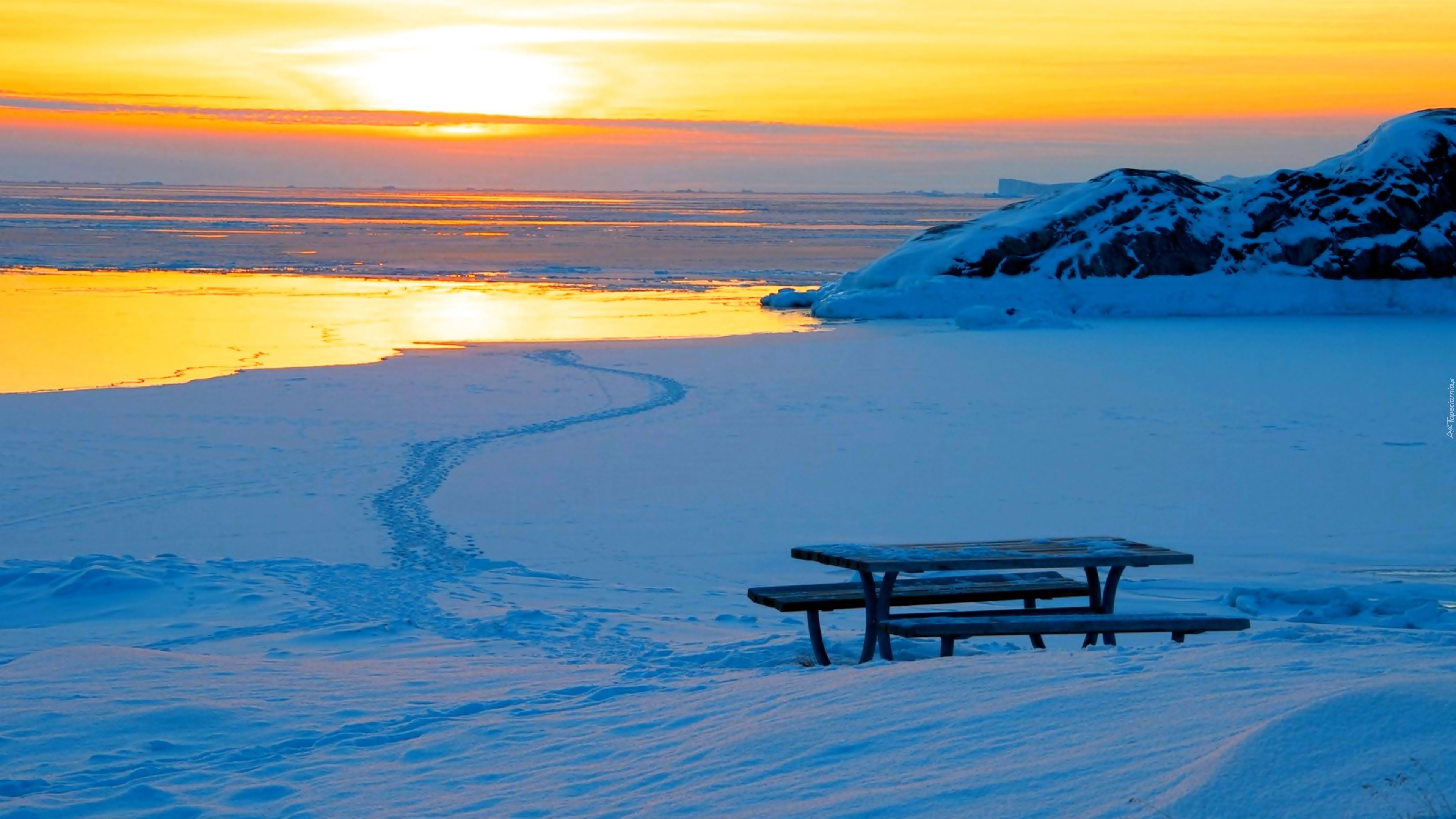 Edytor tapety: Morze, Plaża, Ławka, Góry, Wschod, Słońca, Zima