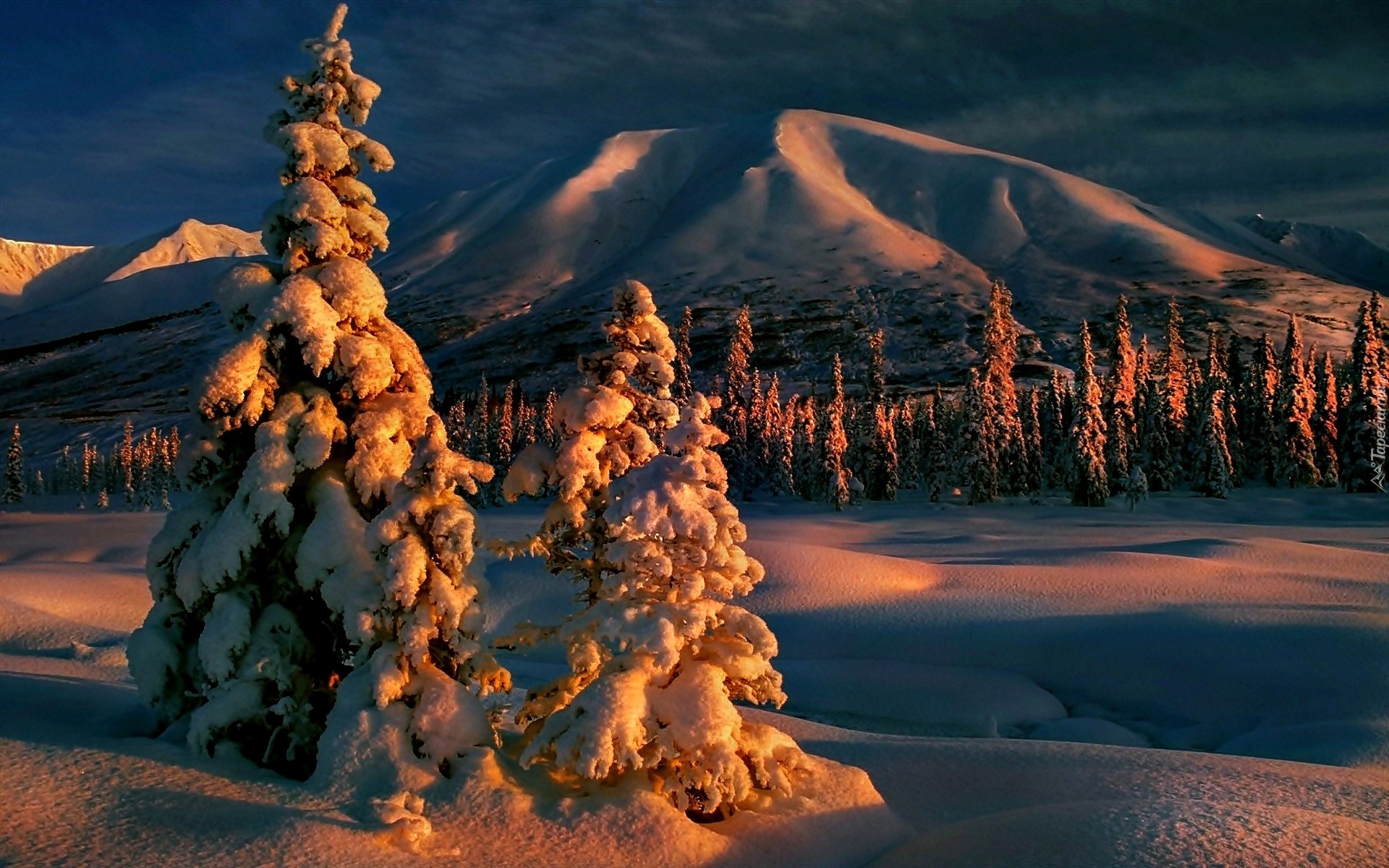 Edytor tapety: Zima, Świerki, Góry, Las, Zachód Słońca