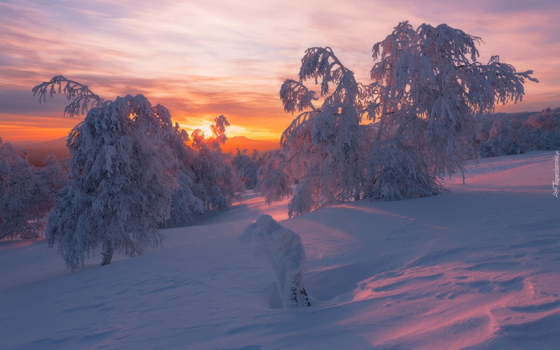 Edytor tapety: Zima, Śnieg, Wschód słońca