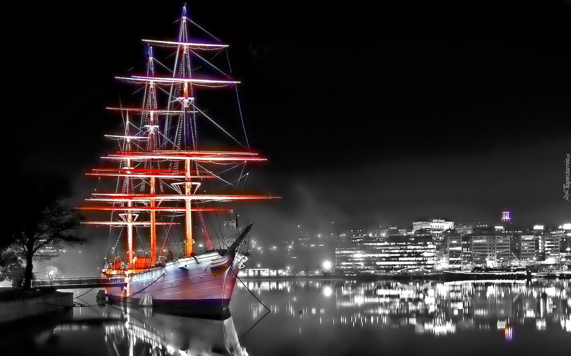 Edytor tapety: Przycumowany, Żaglowiec, Nabrzeże, Nocą, Rzeka, Mgła