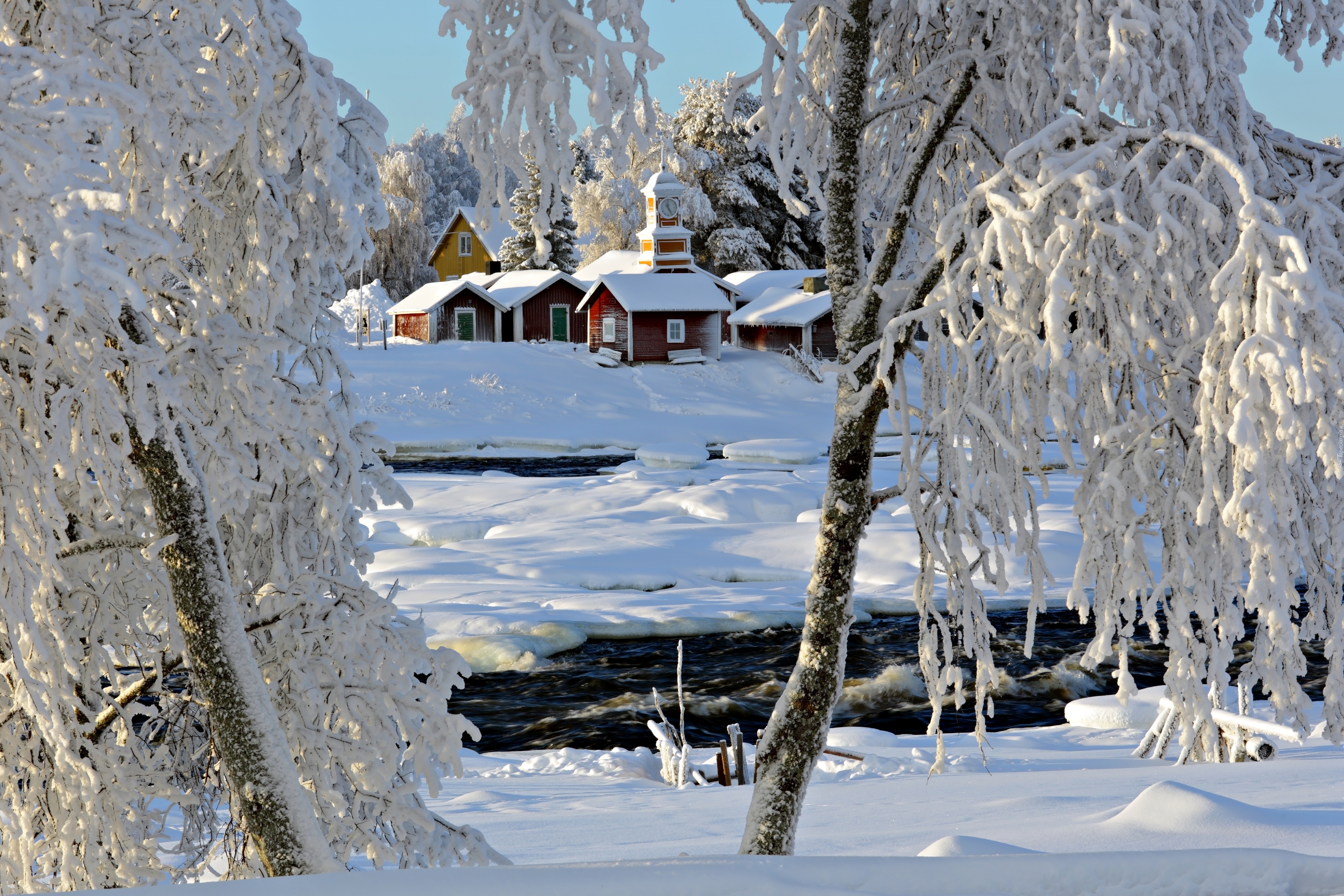 Edytor tapety: Zima, Potok, Kościół, Wieś
