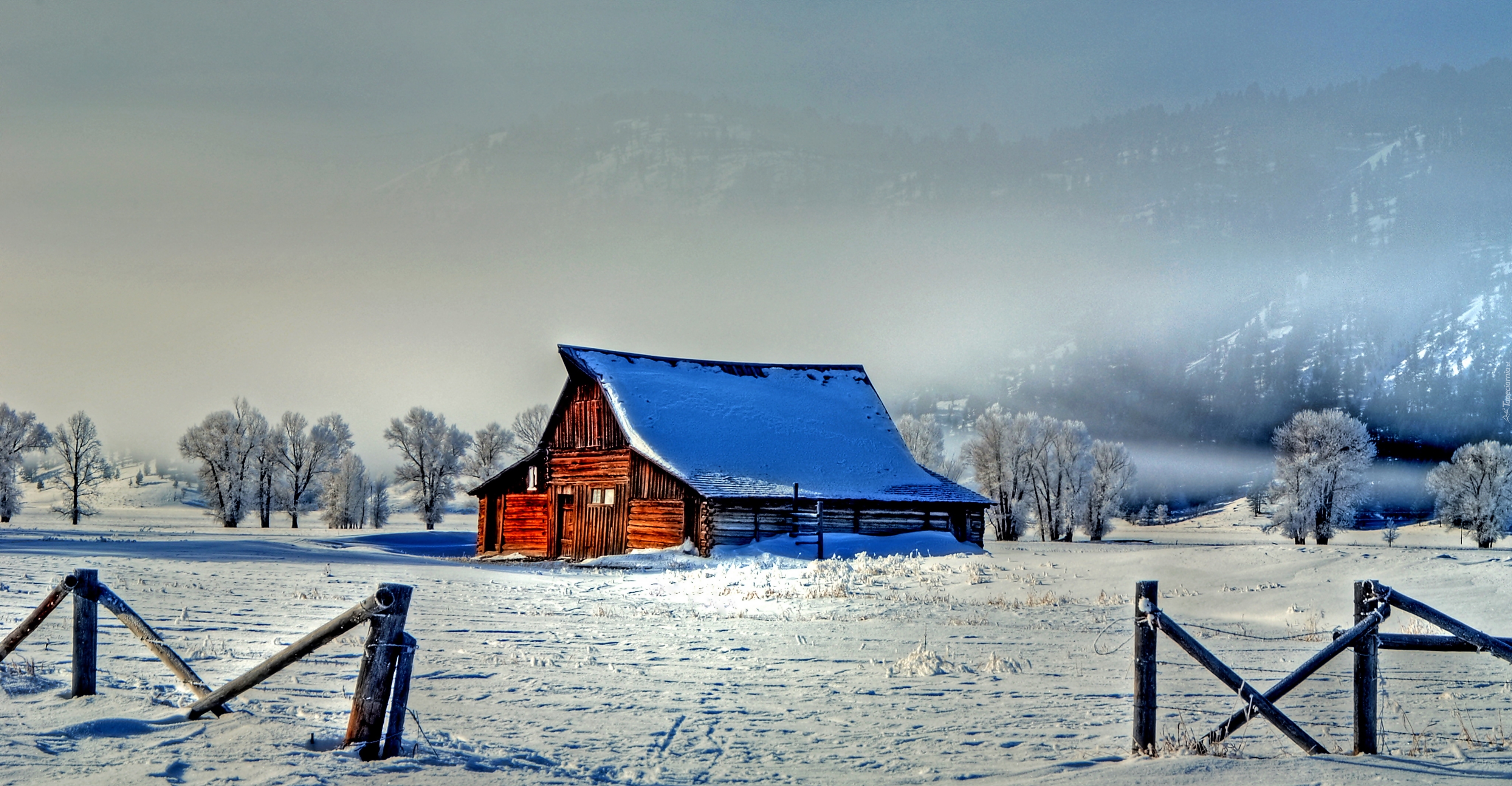 Edytor tapety: Zima, Dom, Ośnieżone, Drzewa ,Płot, Góry, Mgła