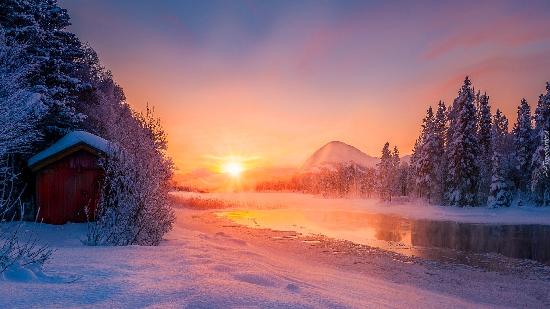 Edytor tapety: Zima, Śnieg, Las, Rzeka, Wschód słońca