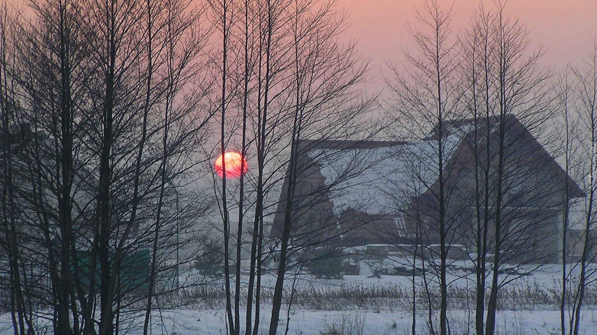 Edytor tapety: Wschód, Słońca, Nad, Wsią, Zima, Drzewa