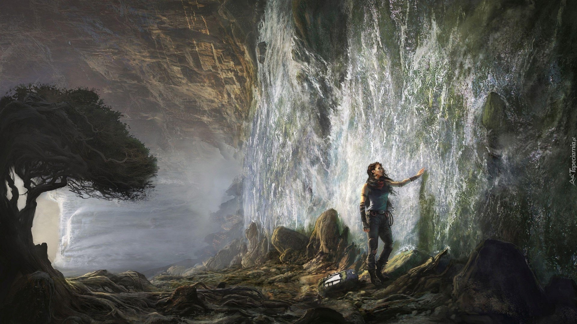 Edytor tapety: Fantasy, Dziewczyna, Wodospad, Skała, Kamienie