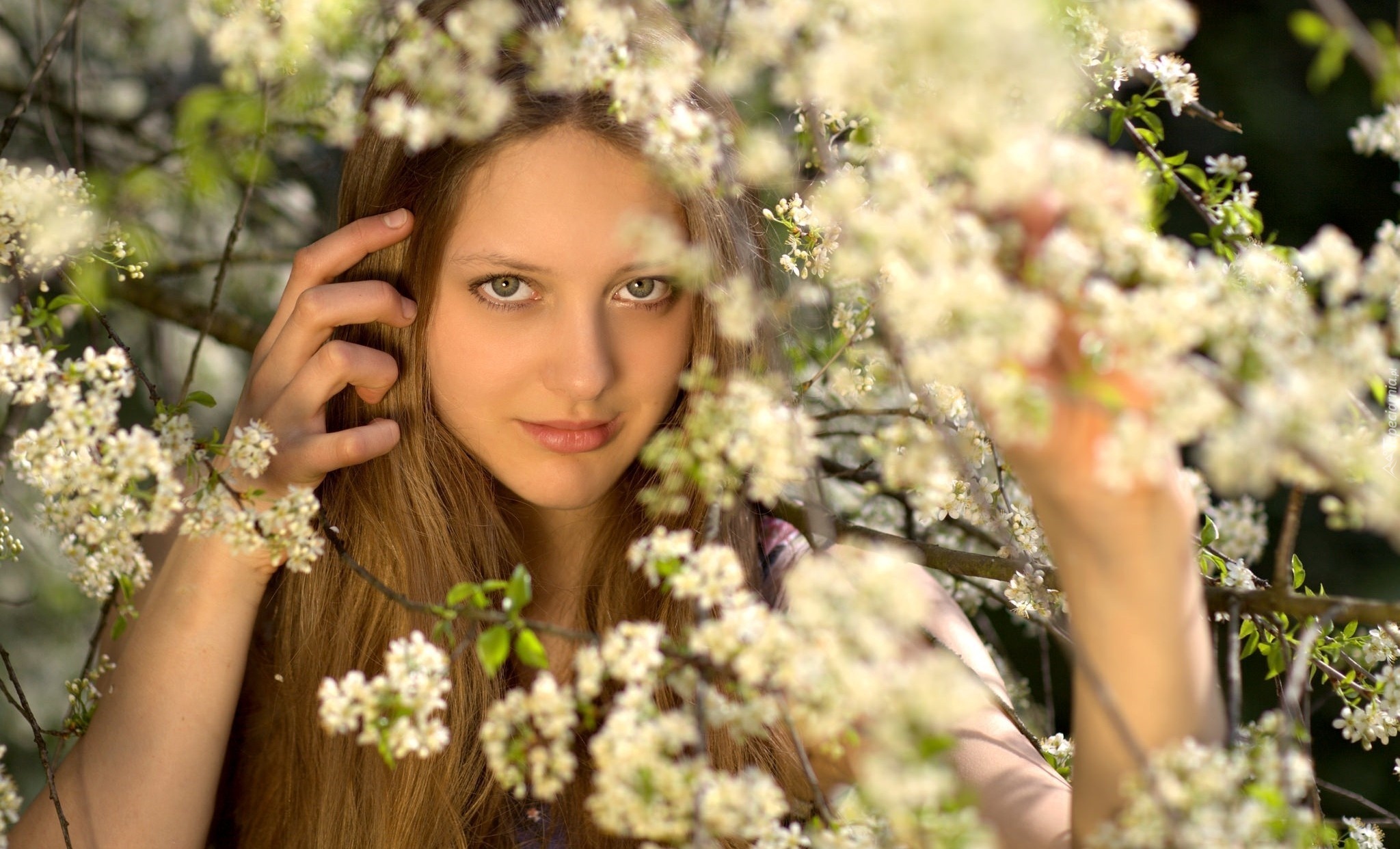 Edytor tapety: Kwitnące, Drzewo, Uśmiechnięta, Dziewczyna