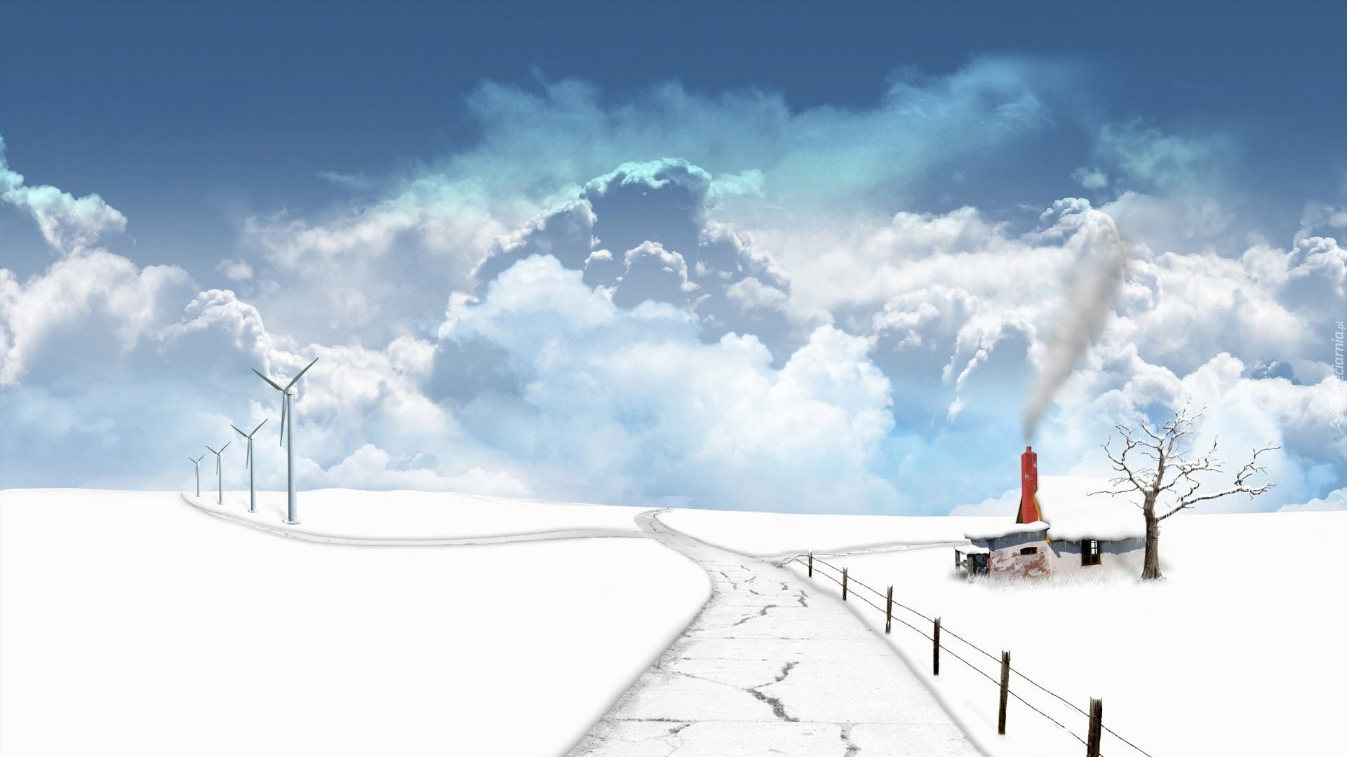 Edytor tapety: Zima, Śnieg, Pole, Droga, Wiatraki ,Drzewo, Budynek, Chmury