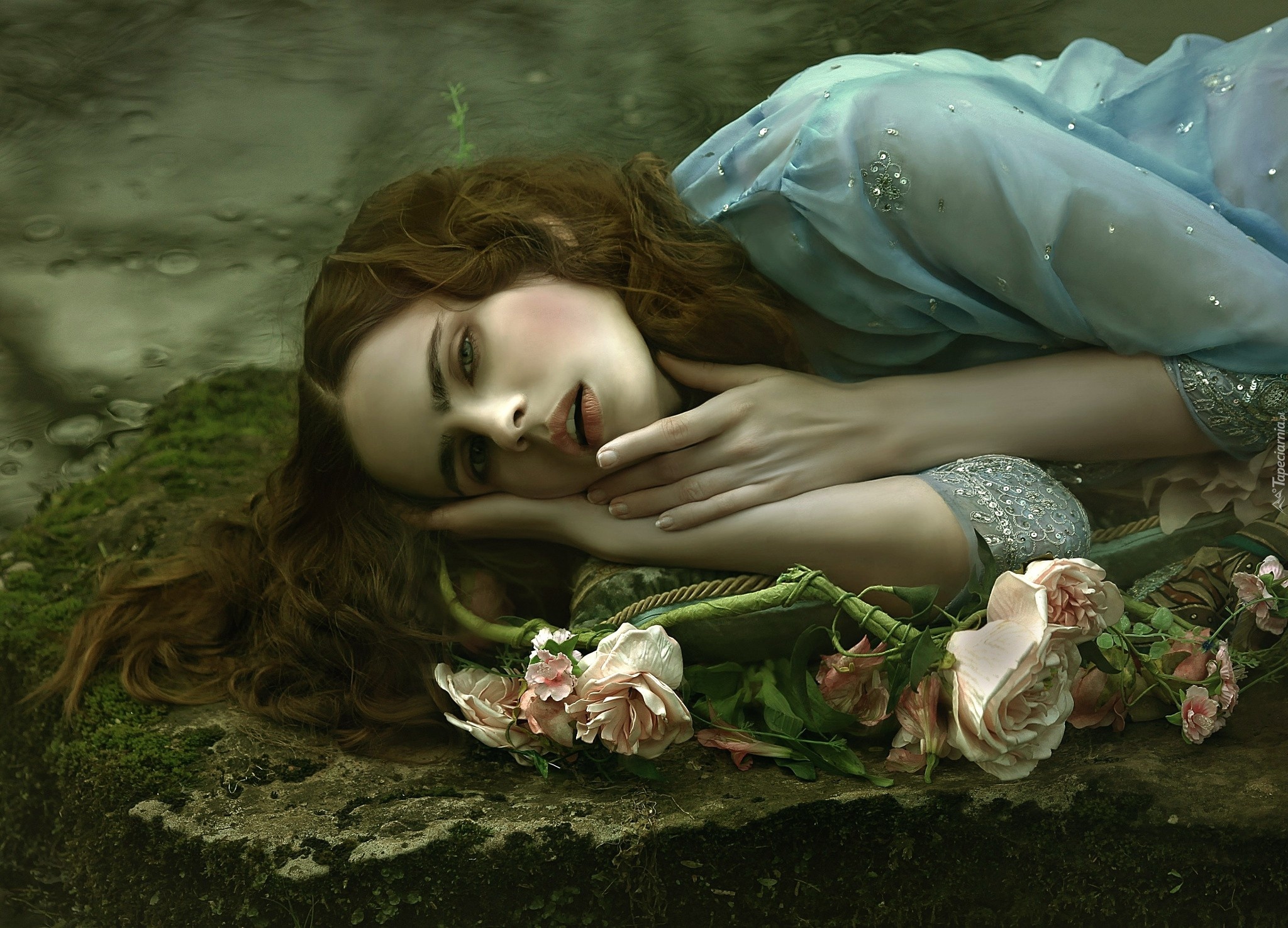 Edytor tapety: Leżąca, Kobieta, Róże, Kamień