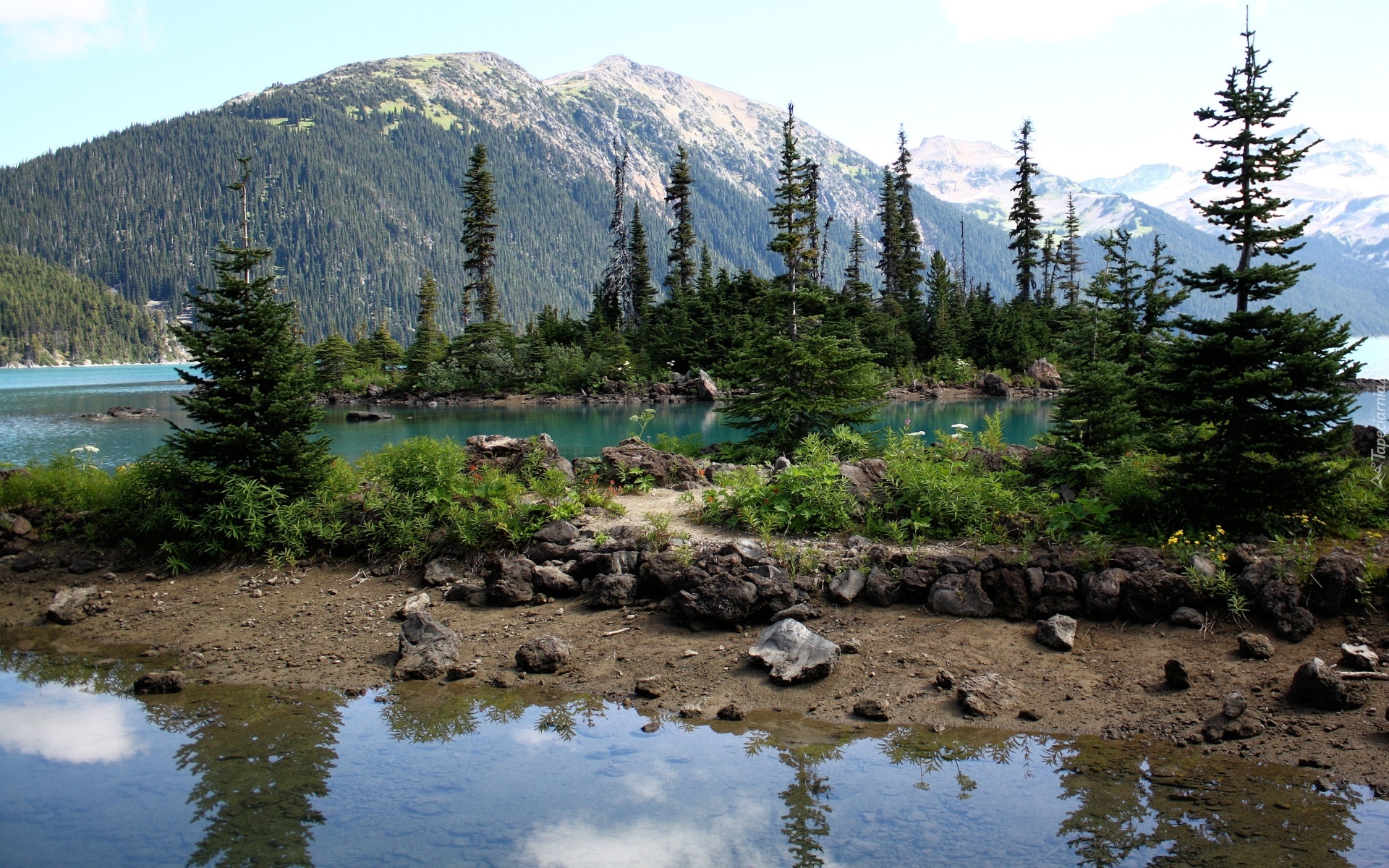 Edytor tapety: Góry, Ośnieżone, Drzewa, Jezioro