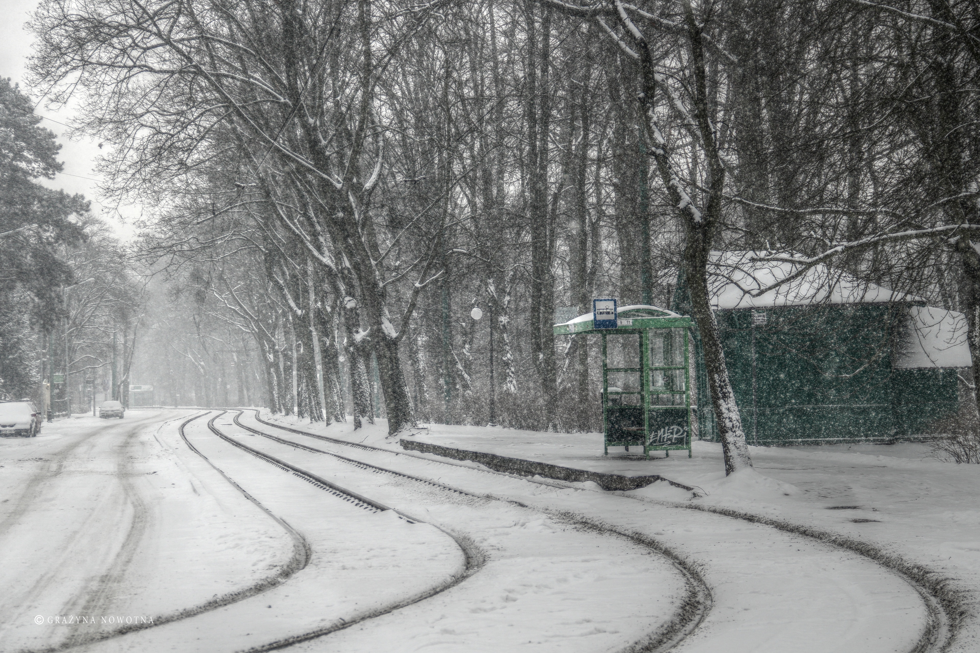 Edytor tapety: Zima, Śnieg, Tory, Przystanek, Poznań, Sołacz