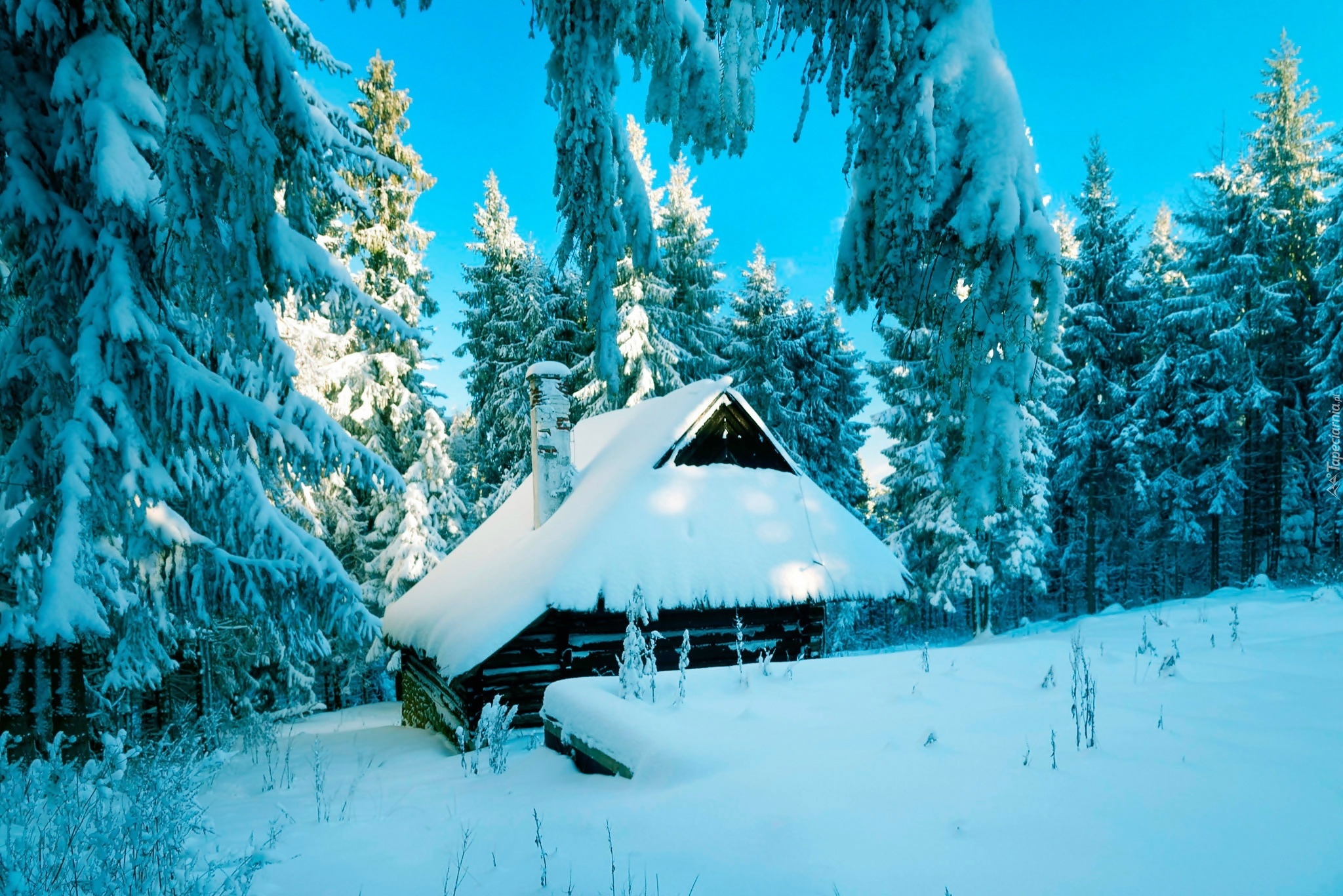Edytor tapety: Zima, Dom, Drzewa, Świerki