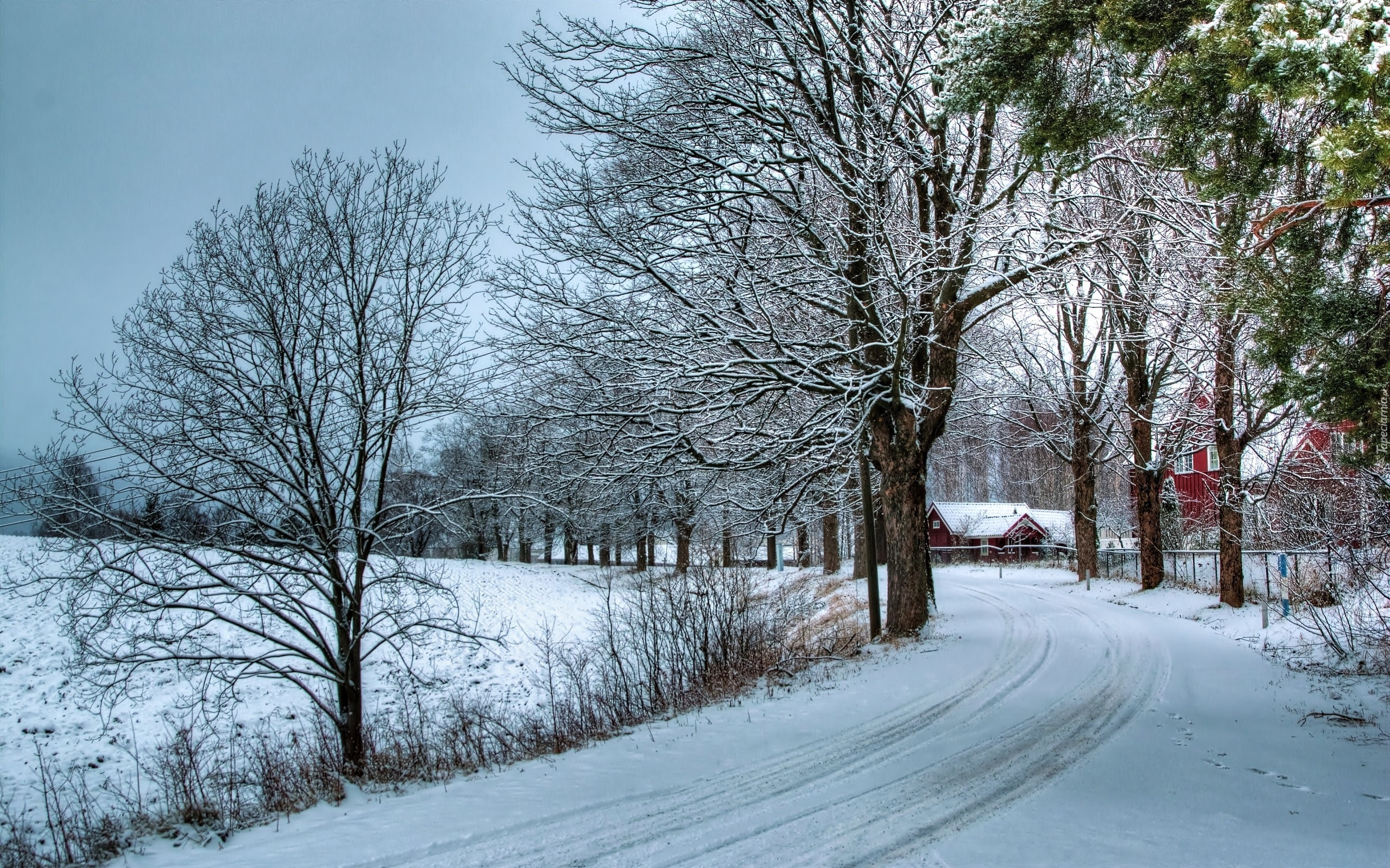 Edytor tapety: Zima, Droga, Drzewa, Śnieg, Domy