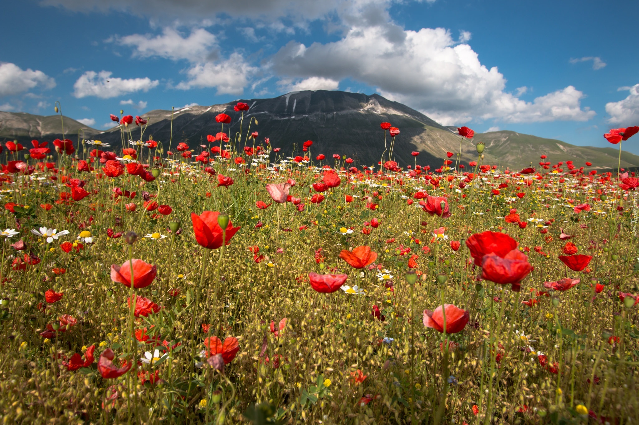 Edytor tapety: Łąka, Maki, Wulkan, Chmury