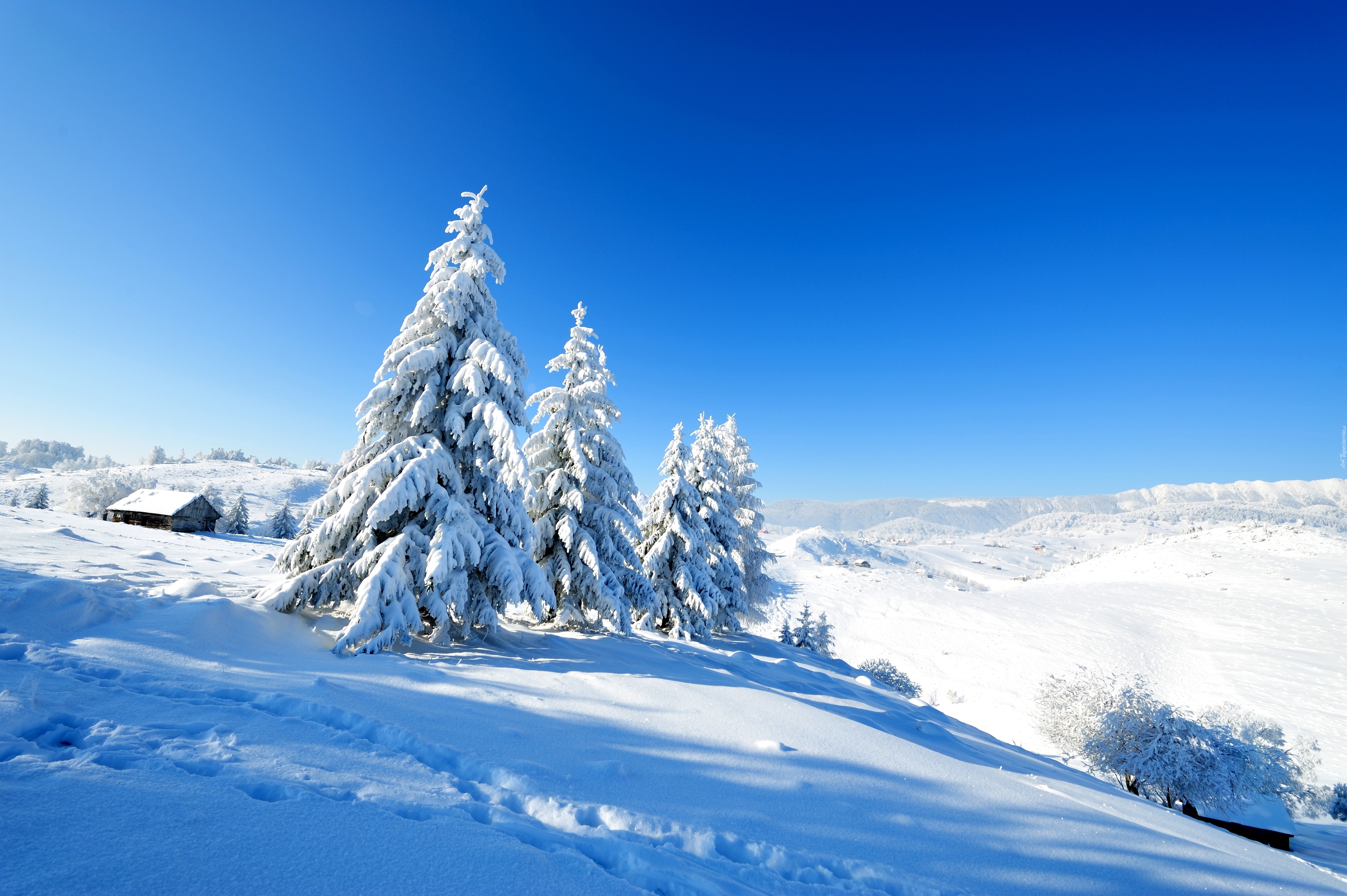 Edytor tapety: Zima, Domy, Wzgórza, Ośnieżone, Drzewa