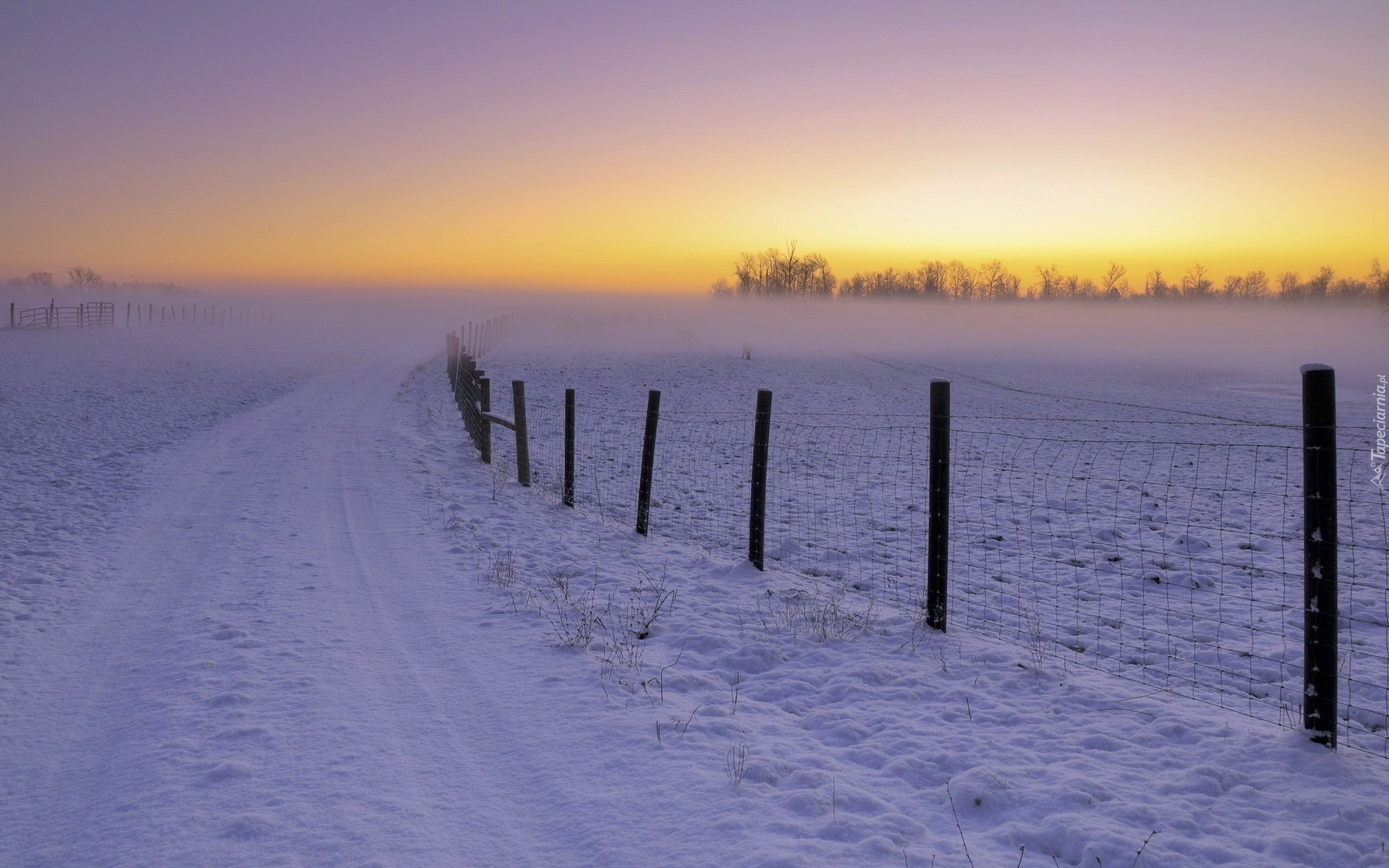 Edytor tapety: Pole, Śnieg, Droga, Ogrodzenie, Wschód słońca