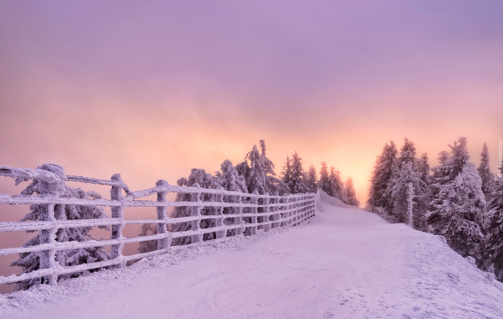 Edytor tapety: Zima, Ogrodzenie, Ośnieżone, Drzewa, Wschód słońca
