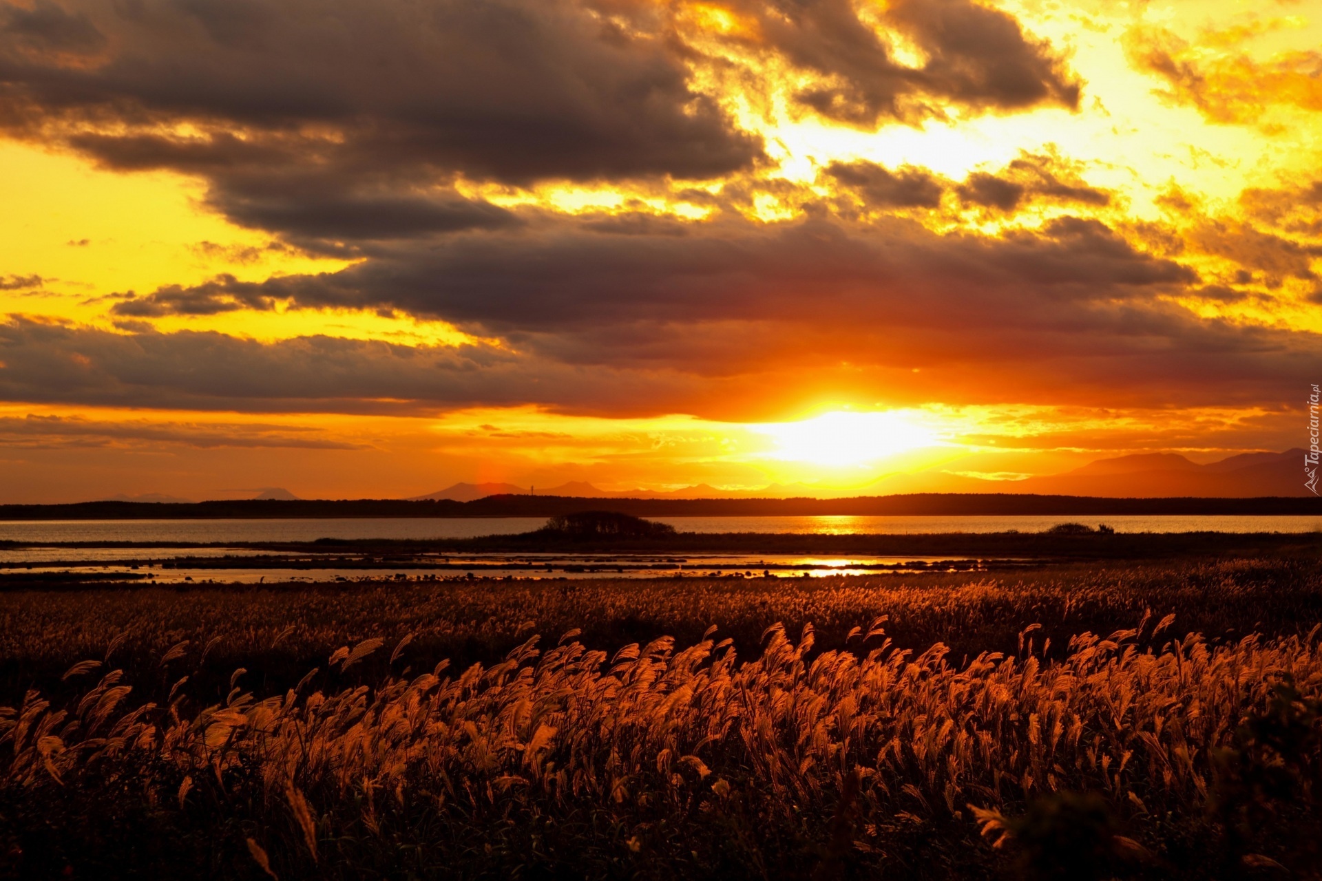 Edytor tapety: Wschód słońca, Jezioro, Chmury