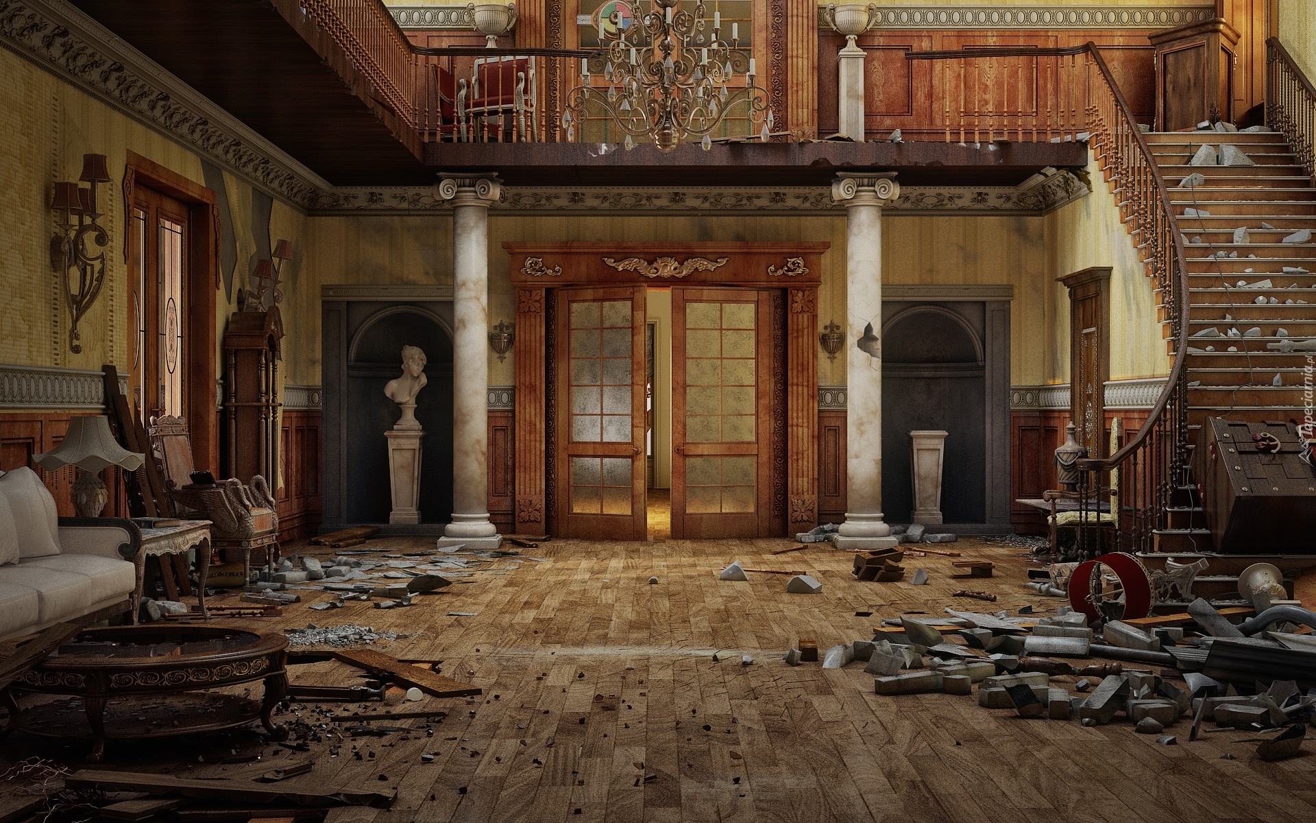 Edytor tapety: Zaniedbany, Salon, Schody, Kolumny