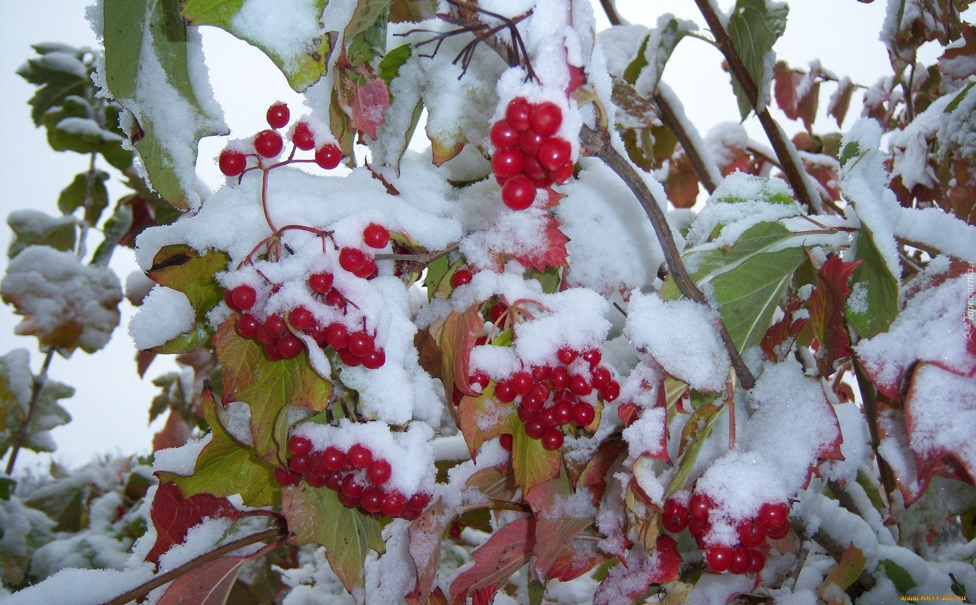Edytor tapety: Śnieg, Liście, Owoce Ośnieżone