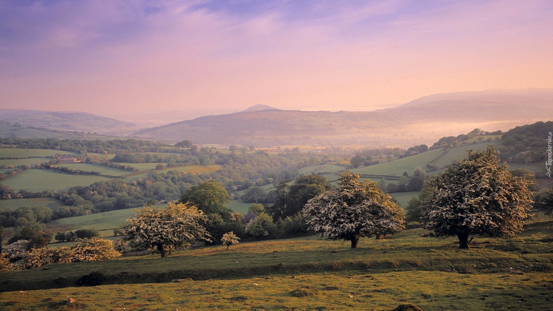 Edytor tapety: Góry, Pola, Drzewa, Mgła