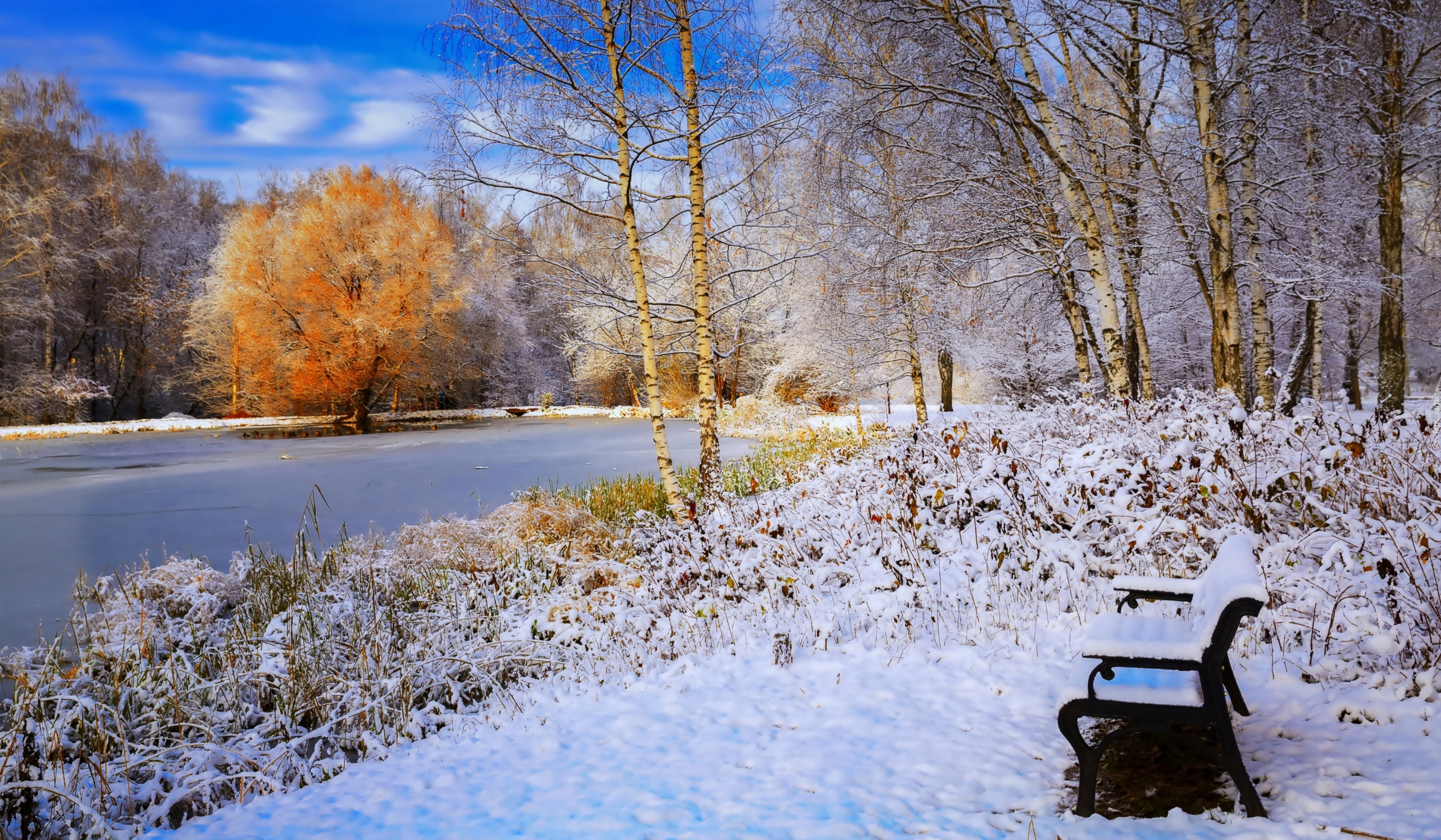 Edytor tapety: Staw, Kaczki, Ławeczka, Brzozy, Park, Zima