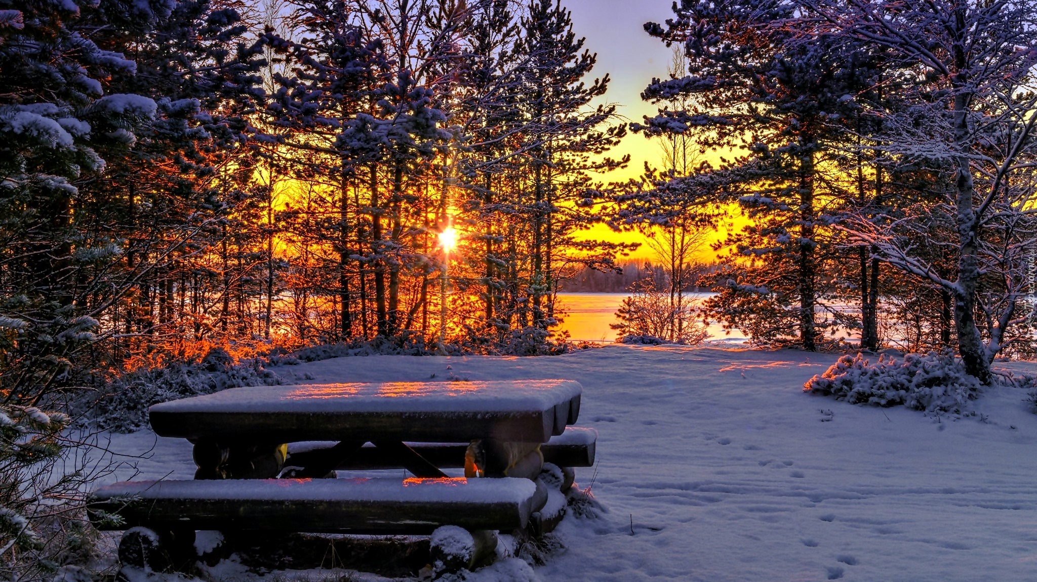 Edytor tapety: Zima, Ławka, Zachód Słońca, Rzeka