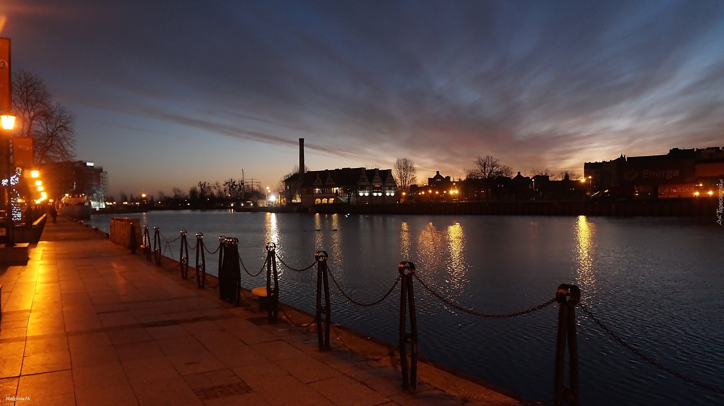 Edytor tapety: Miasto, Nabrzeże, Wschód Słońca, Budynki, Woda, Gdańsk