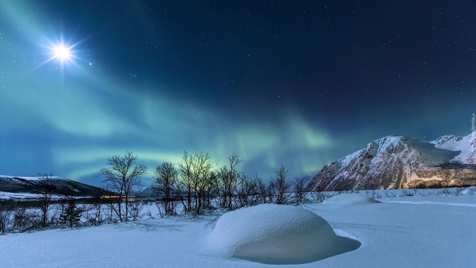 Edytor tapety: Śnieg, Góry, Drzewa, Słońce, Zorza