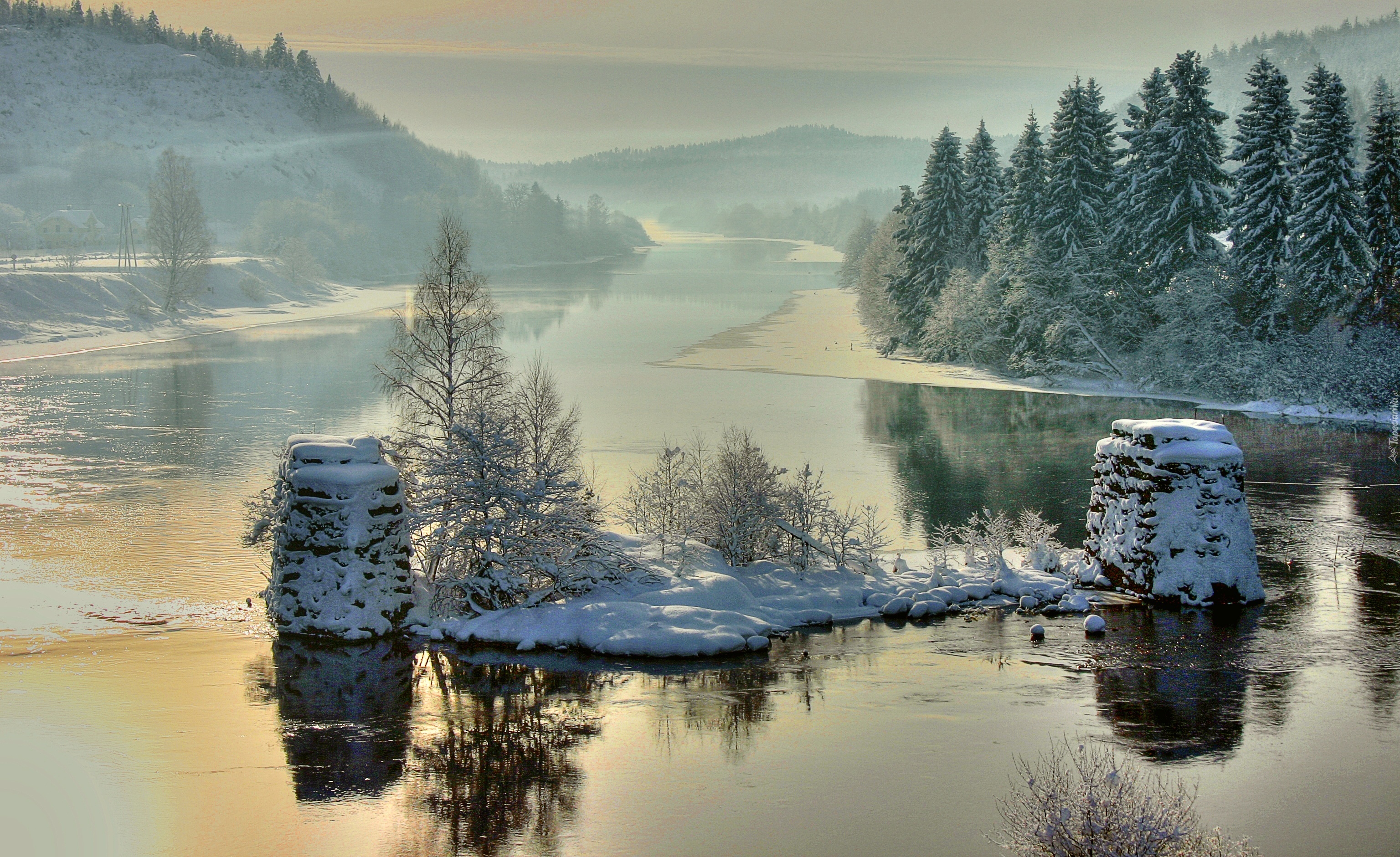 Edytor tapety: Rzeka, Góry, Drzewa, Śnieg