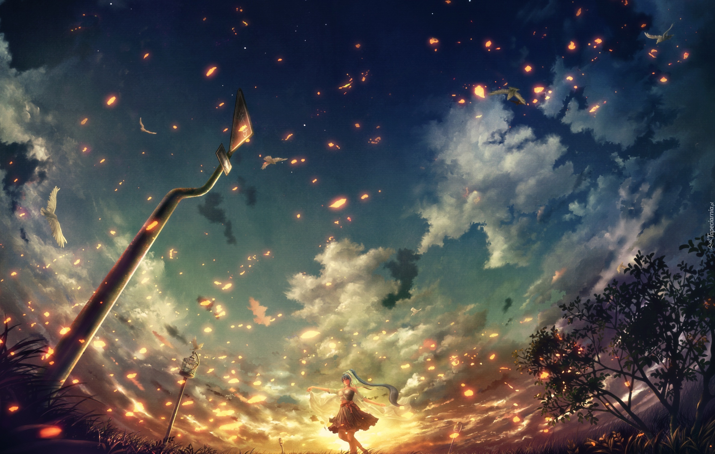 Edytor tapety: Fantazja, Kobieta, Chmury, Drzewa, Ogniki