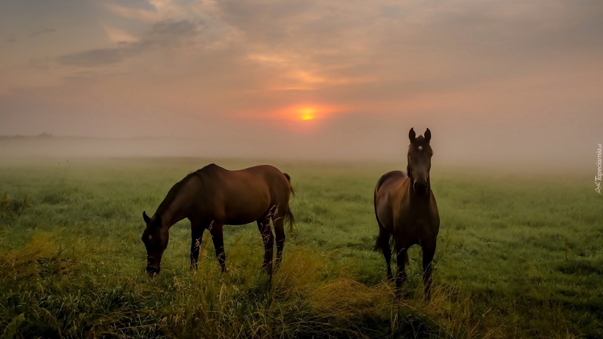 Edytor tapety: Dwa, Konie, Pastwisko, Zachód Słońca, Mgła