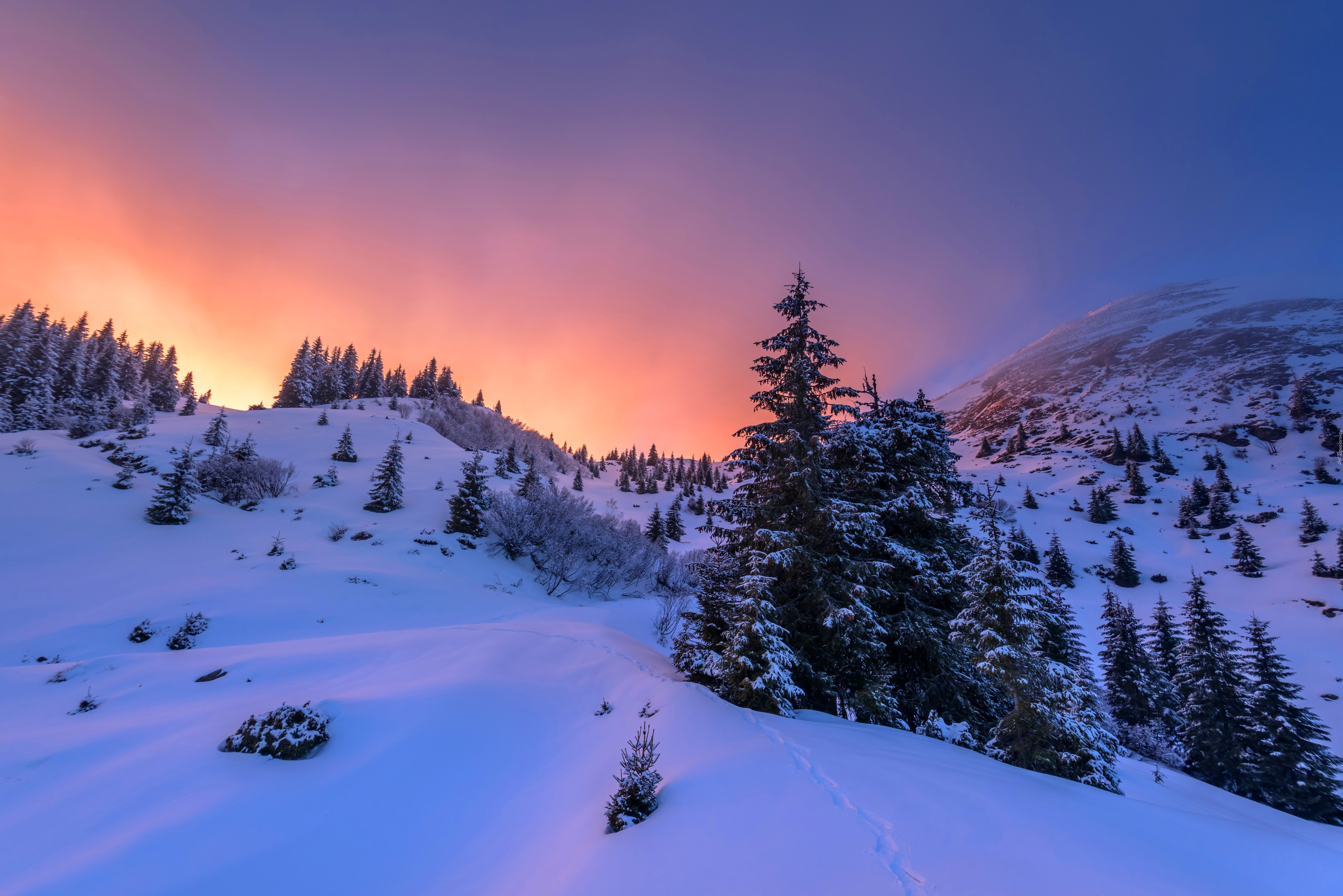 Edytor tapety: Zima, Góry, Drzewa, Zachód Słońca, Śnieg