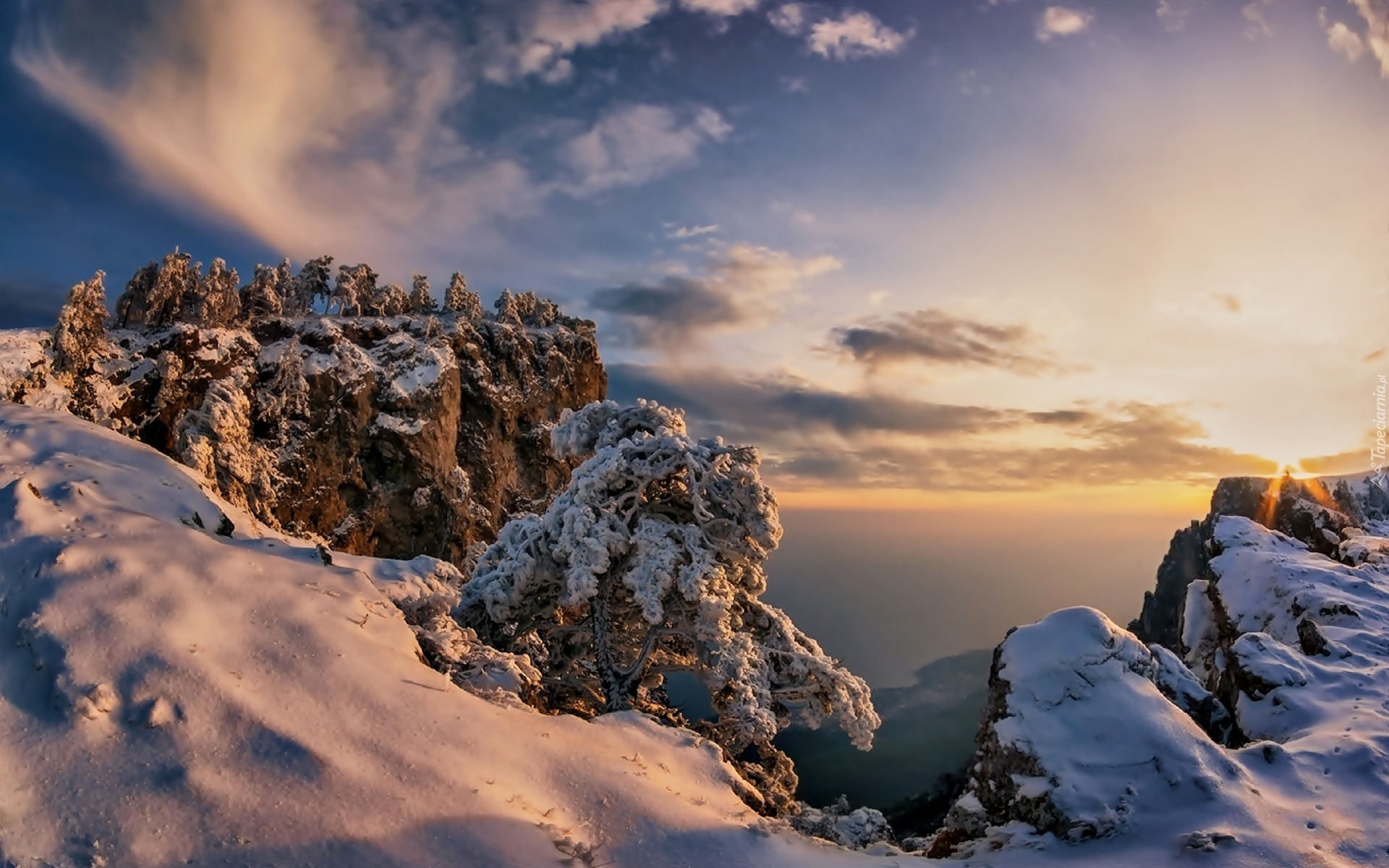 Edytor tapety: Zima, Śnieg, Góry, Jezioro, Zachód Słońca, Skały