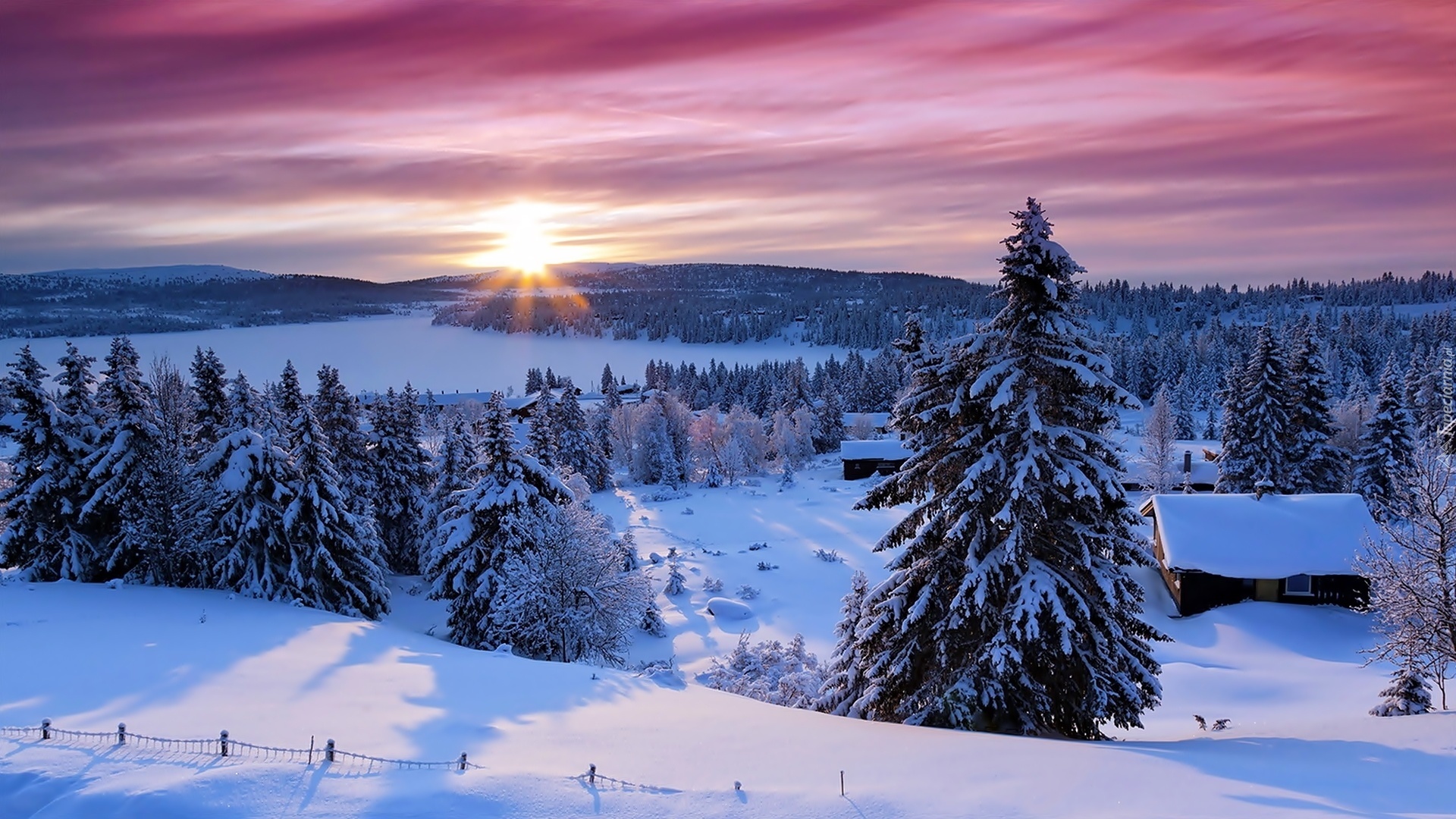 Edytor tapety: Góry, Lasy, Zachód Słońca, Wioska, Zima